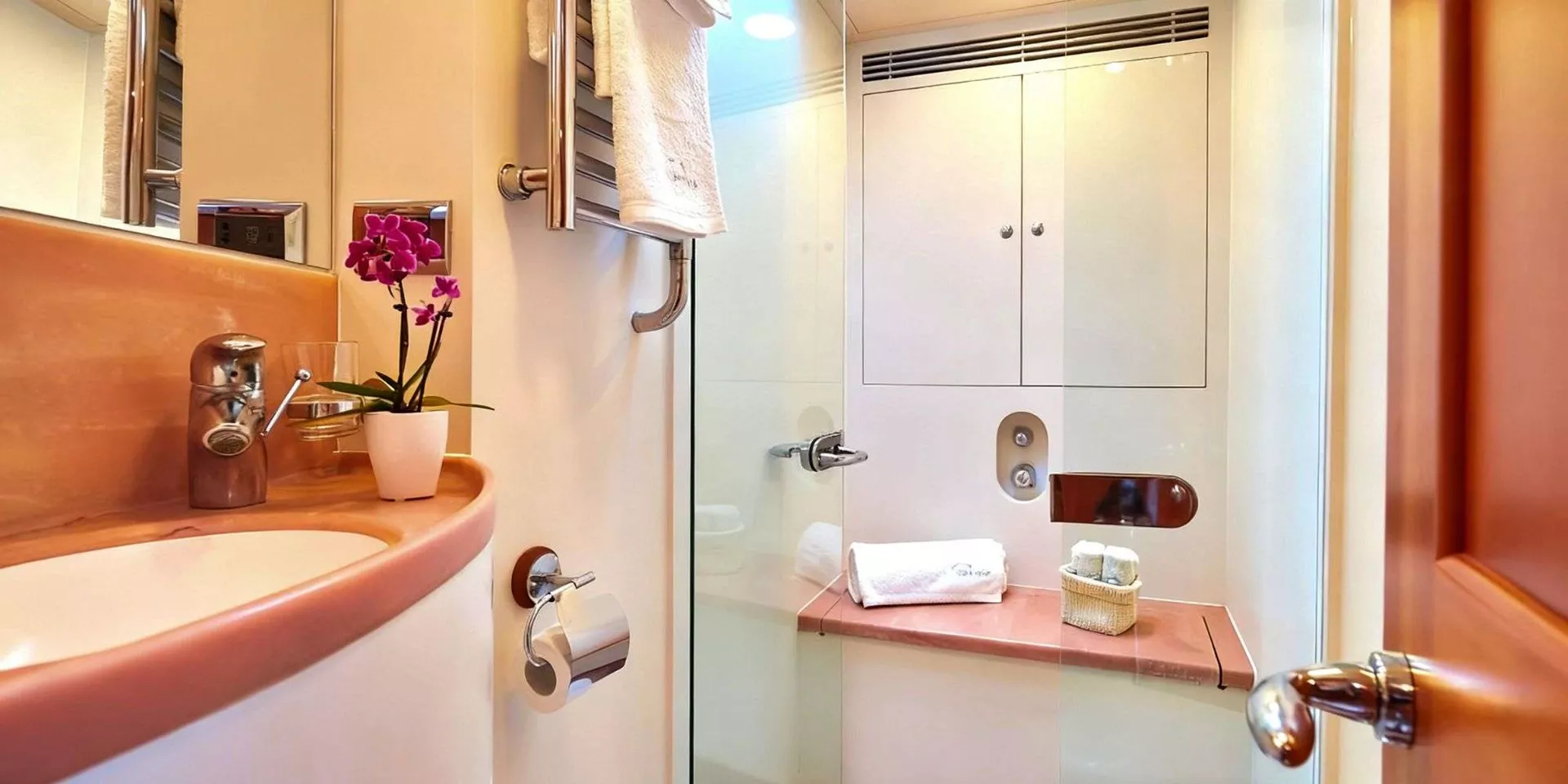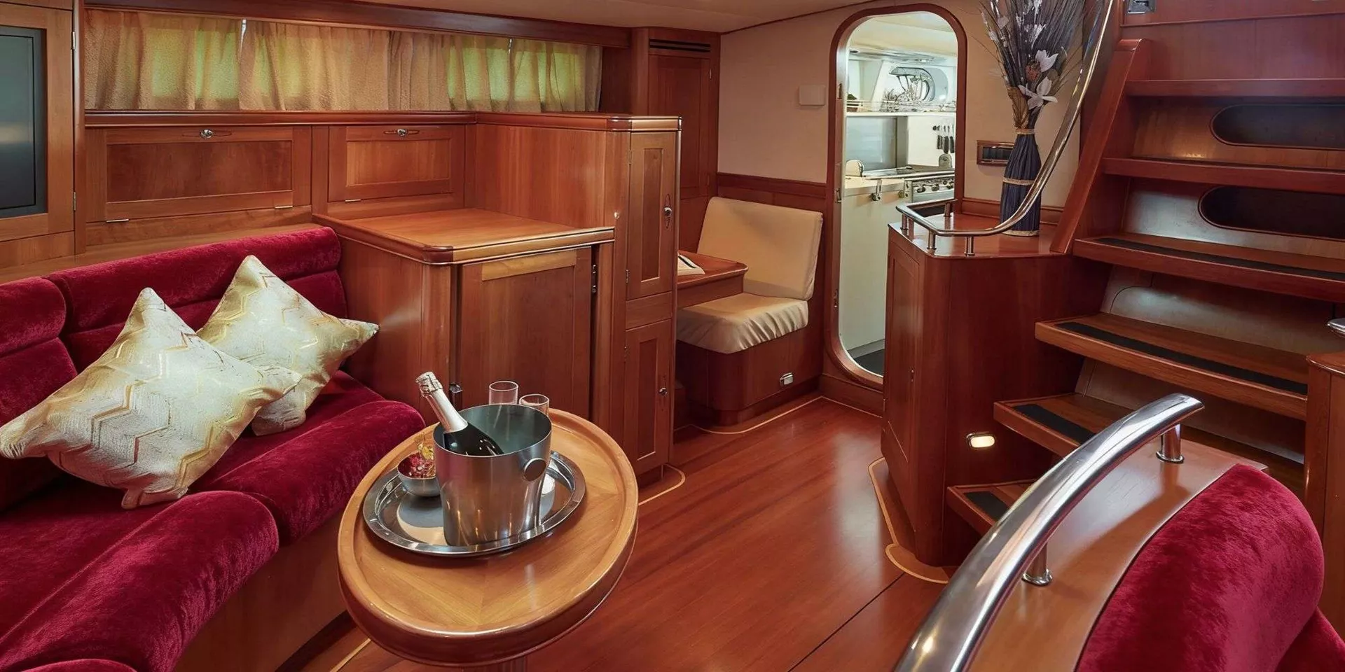 Cruising, she accommodates up to 11 guests (with 4 crew) or 12 guests (with 3 crew).