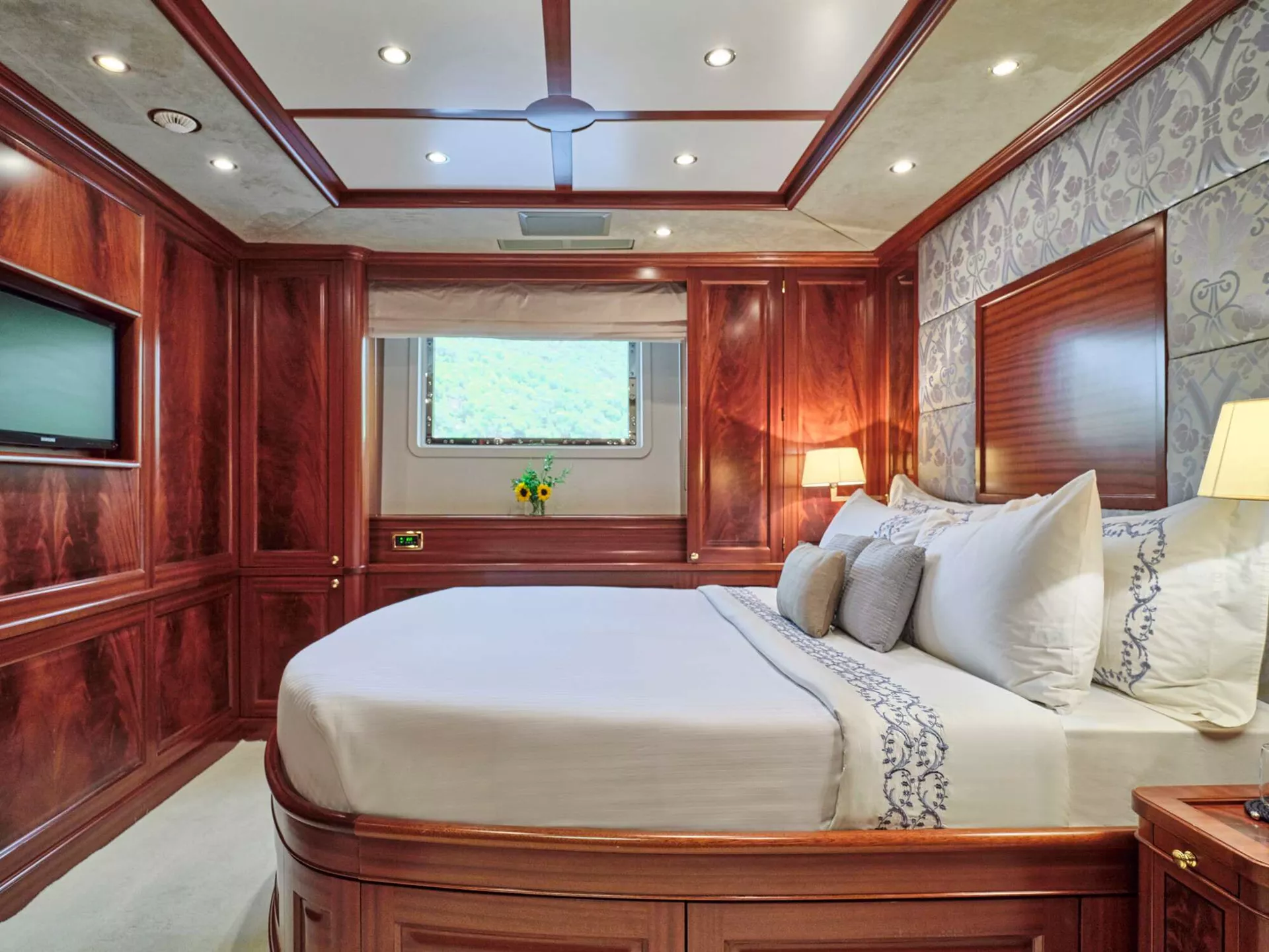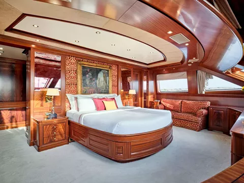 A full beam Master stateroom on the Main Deck with king-size bed, en-suite facilities, and sauna.