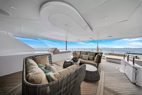 - King Master Stateroom, full beam, and ensuite bathroom aft of pilothouse with private access to aft sky lounge deck. Ensuite bathroom features a separate shower and jacuzzi soaking tub.