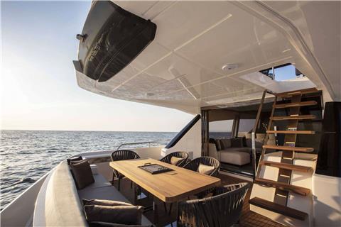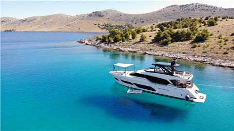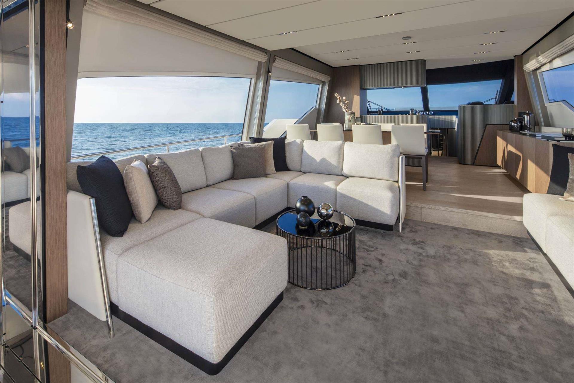 Her generous flybridge invites guests to unwind and socialize, while multiple deck areas provide the perfect setting for al fresco dining, relaxation, and panoramic sea views. A hydraulic swim platform ensures effortless access to the water, ideal for relaxing at sea level, or simply enjoying a refreshing plunge.