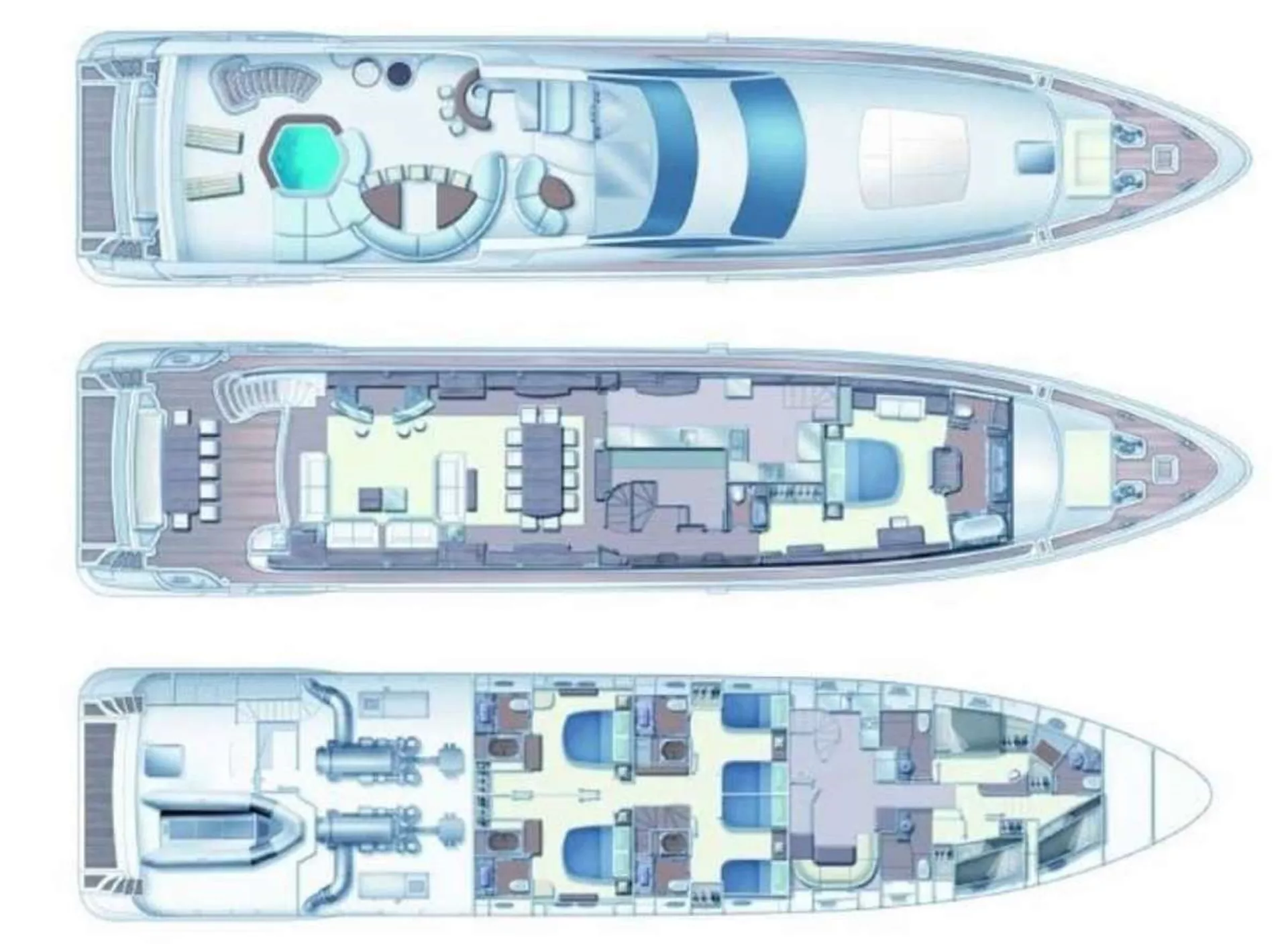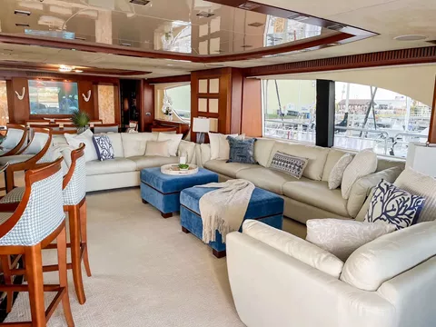 Spacious Main Salon with full bar area and entertainment center, formal dining forward seating up to 10 guests with custom glass panels. Main Deck: full walk-around to large high bow with upper and lower sunpads, aft deck seating for 10 w/ wet bar and TV. Master King forward on Main deck with large windows, ensuite marble bathroom, Jacuzzi tub, separate shower.