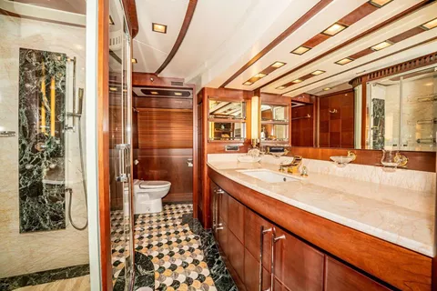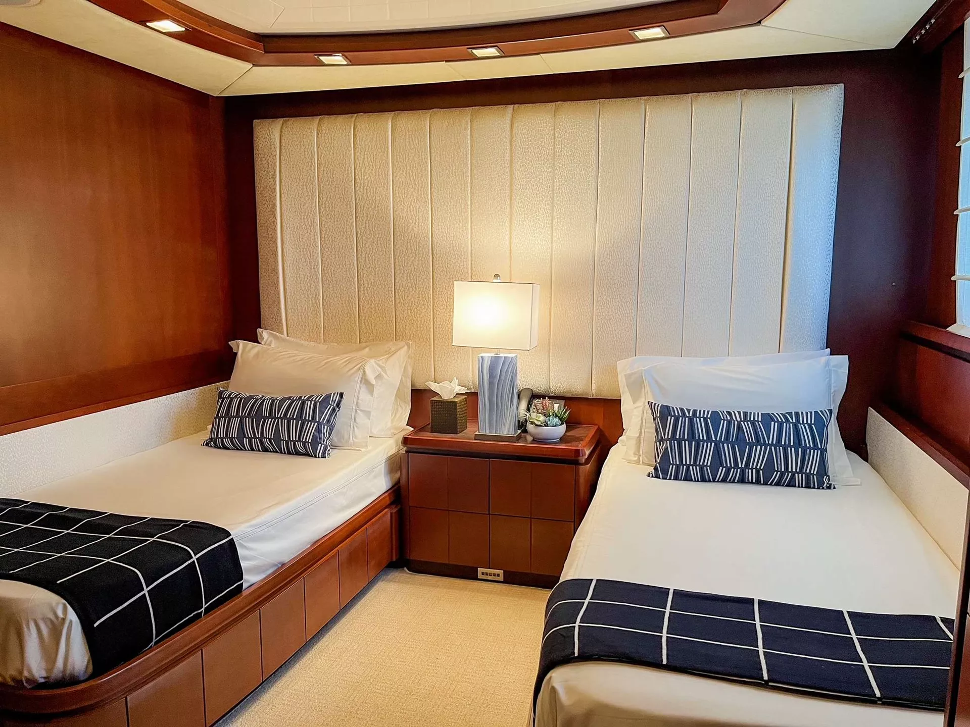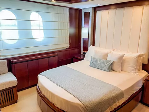 Retreat to the full beam master stateroom located forward on the main deck, featuring large windows, an ensuite with beautiful marble, large Jacuzzi tub, and jet shower. Below deck, you will find two cabins with a queen bed in each and a desk, and two cabins fitted with 2 twin beds in each. Each cabin has its own ensuite, TV, and plenty of closet space.