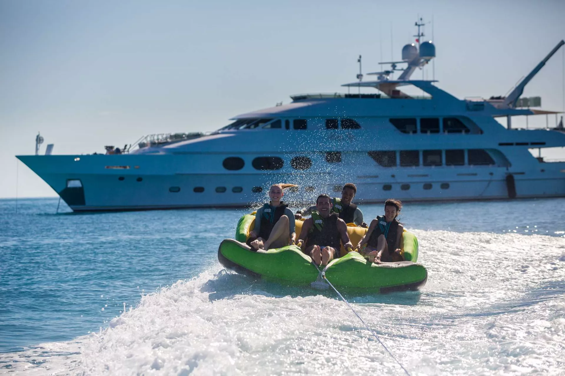 Towables: Wakeboard, Waterskis for adults, children and slalom, inflatable Banana Tube 5-person “hot dog”, doughnuts and more.