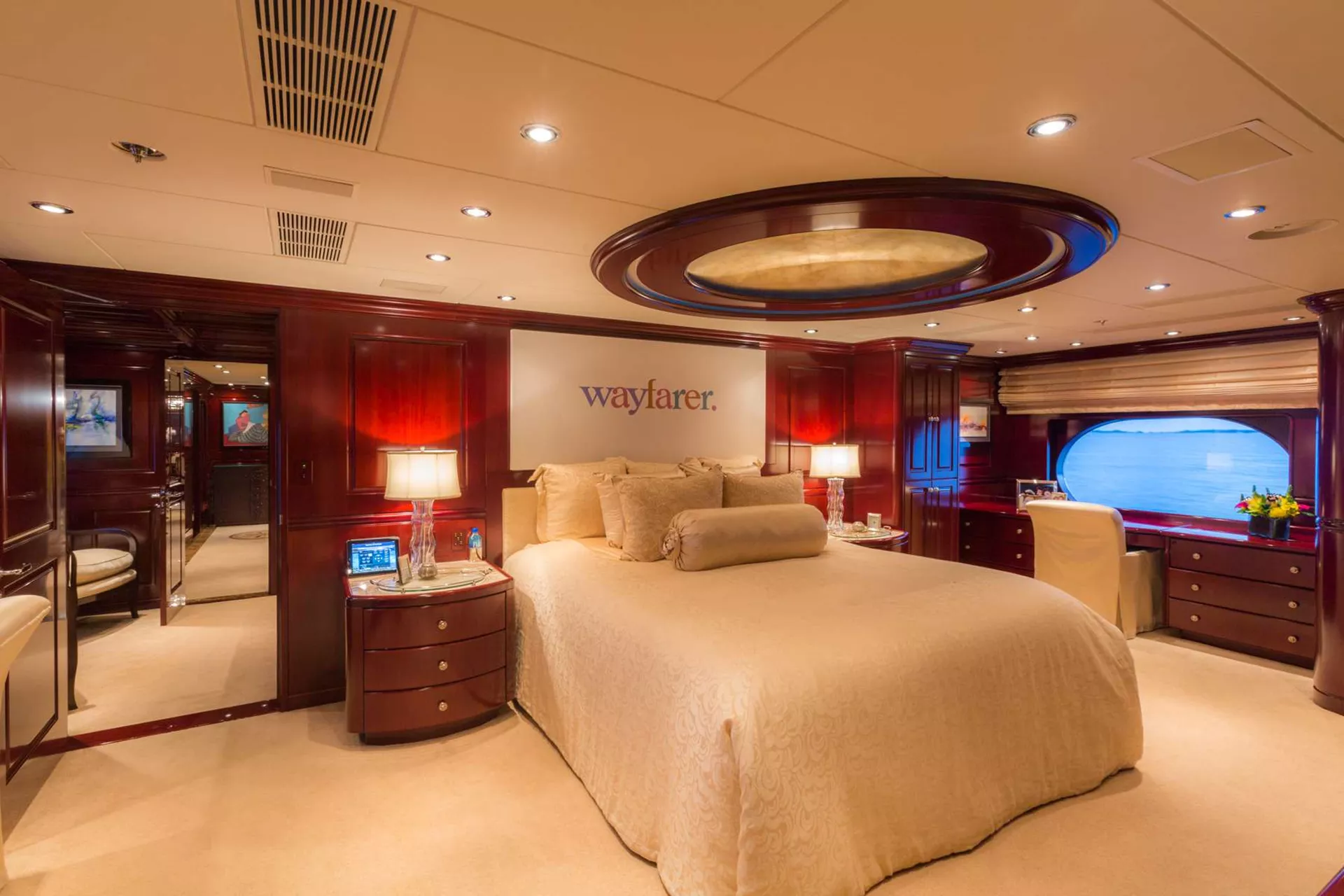 On deck, forward, full-beam Master Stateroom: Upon entry, there is a private office with desk facing large windows for a gorgeous view.