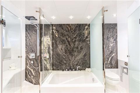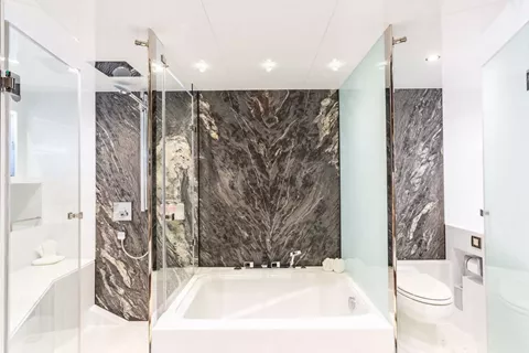 With a huge 24’ beam Angeleyes offers a cabin layout and volume unmatched by similar sized motor yachts. She offers 5 double, en-suite cabins, making her the perfect choice for a group of 5 couples. Angeleyes offers an on-deck master suite with a huge master bath complete with rain shower and jacuzzi tub. Below deck are 2 walk around VIP suites with Queen beds and 2 staterooms with 2 twin beds that both have the option to convert to King beds if preferred.