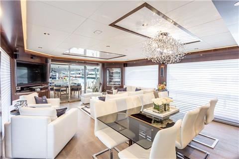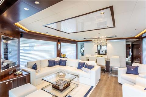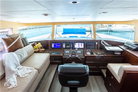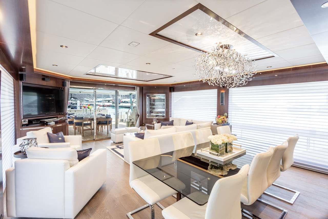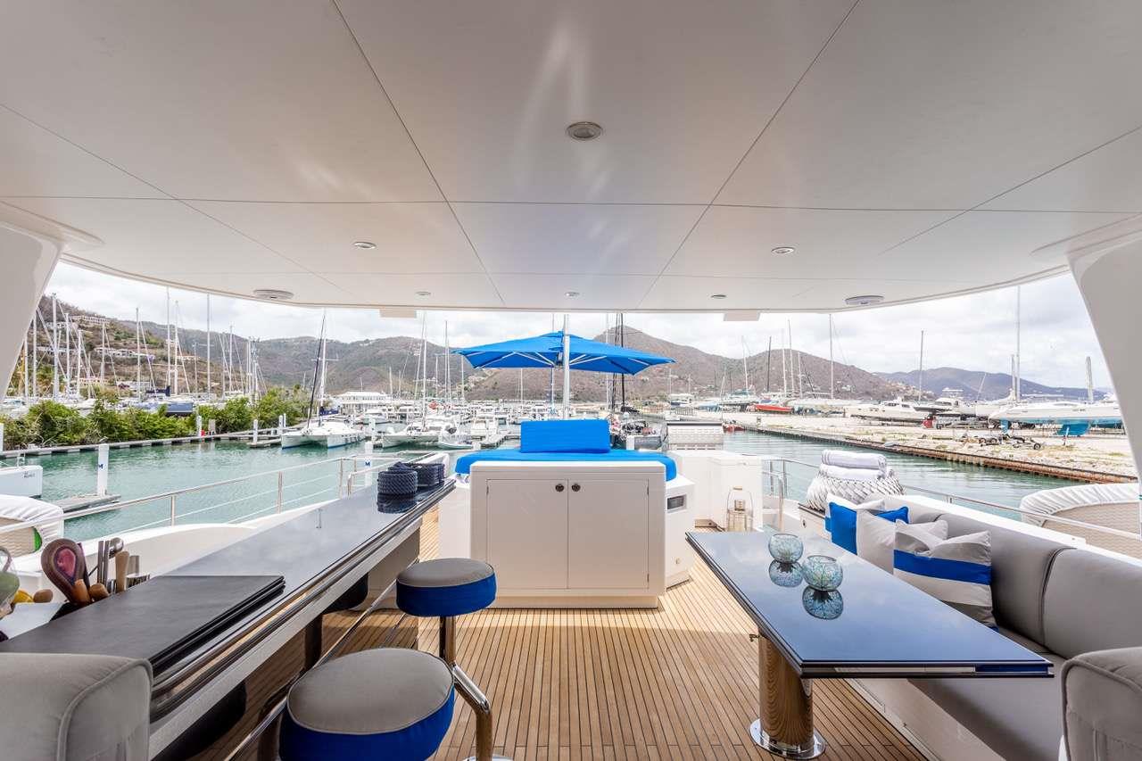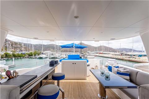 Her spacious aft deck and open flybridge invite quality time spent with family and friends. The flybridge is the perfect space for guests to all relax together, with multiple seating area, a large hot tub, full wet bar and pop up outdoor TV that can swivel 360 degrees to enjoy at any angle.