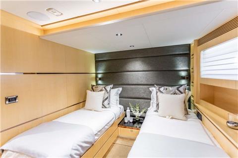 Angeleyes can accommodate 10 guests in 5 double cabins. The 4th cabin is convertible from 2 twins to a Queen and the 5th cabin is convertible from 2 twins to a King, if preferred.