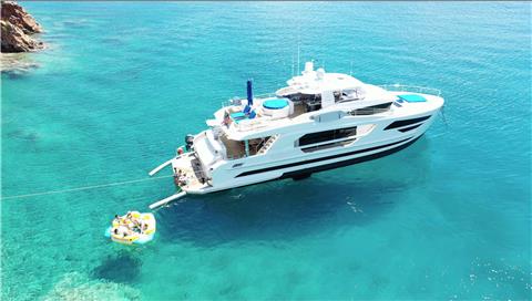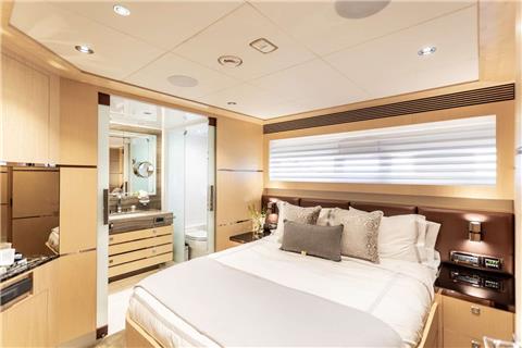 Angeleyes is an stunning example of the Horizon FD85’s design concept: to take advantage of the voluminous 24' beam and provide areas, both indoors and out, for charter guests to enjoy the ultimate yacht for entertaining and relaxing. Angeleyes’ main salon incorporates huge floor-to-ceiling glass windows, allowing guests to enjoy the ever changing island view. The interior dining table can seat 8 and can be used for more formal dining, with another large dining table on the aft deck for 10 when guests prefer to dine alfresco. The interior is modern yet comfortable, mixing elegant Wenge and Sycamore woods with brand new for 2019 neutral soft goods, furniture and upholstery upgrades.