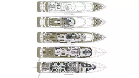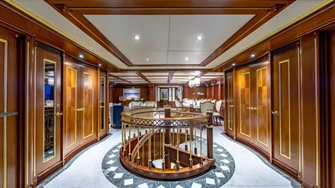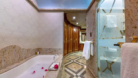 185' STARSHIP has 4 King Staterooms and 2 Twin Staterooms. Her Master suite which is located on the Main Deck forward is full width of the beam and has a King-sized bed. This luxurious cabin has a seating area and desk and a 32" flat-screen TV with surround sound. The suite boasts a semi-circle His and Hers ensuite with separate wash closets and bidets linked by a Spa Pool tub and large shower stall. There is a VIP Cabin with a King bed on the Bridge deck offering 360 degrees views. Below deck, there are 2 VIP cabins with a King bed and ensuite and 2 large Twin cabins with a seating area. The 2 Twin cabins each come outfitted with 2 Queens rather than single beds. Each Cabin has an ensuite, SAT TV and iPod Stations linked to a surround sound system. Movies and music on demand. Creston control and remote systems including Creston Concierge- guests can order off a special menu direct from their cabin 24/7.