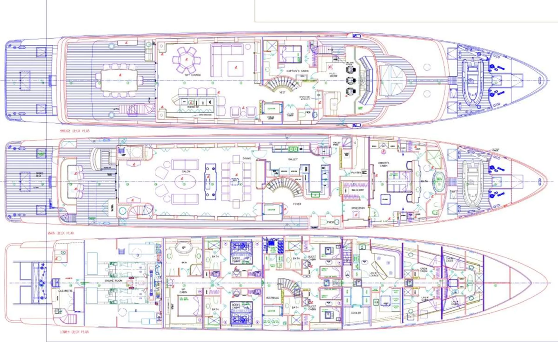 Access to the 5 below guest staterooms are lead by a spectacular sculpted spiral stairwell with railings on either side. The guest foyer below also features a mini-bar.
