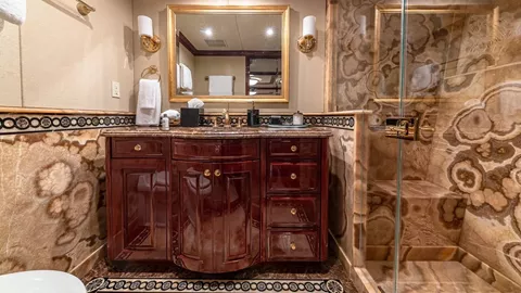 #2 - VIP GUEST STATEROOM: This FULL BEAM stateroom features a walk around King size bed, vanity/desk, and 50” flat screen TV. En-suite bath features an over-sized Jacuzzi tub, heated floors, shower, sink & toilet. Safe. iPod docking station.
