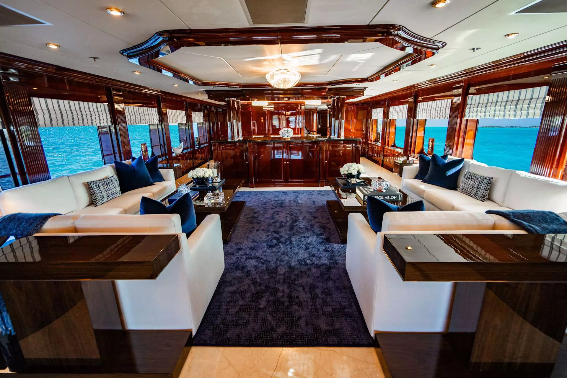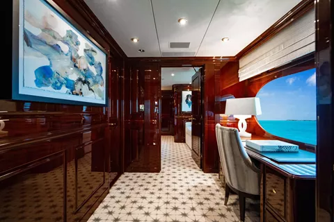 - Features a 60” flat screen TV (hidden behind artwork), surround sound, vanity to port and couch to starboard.