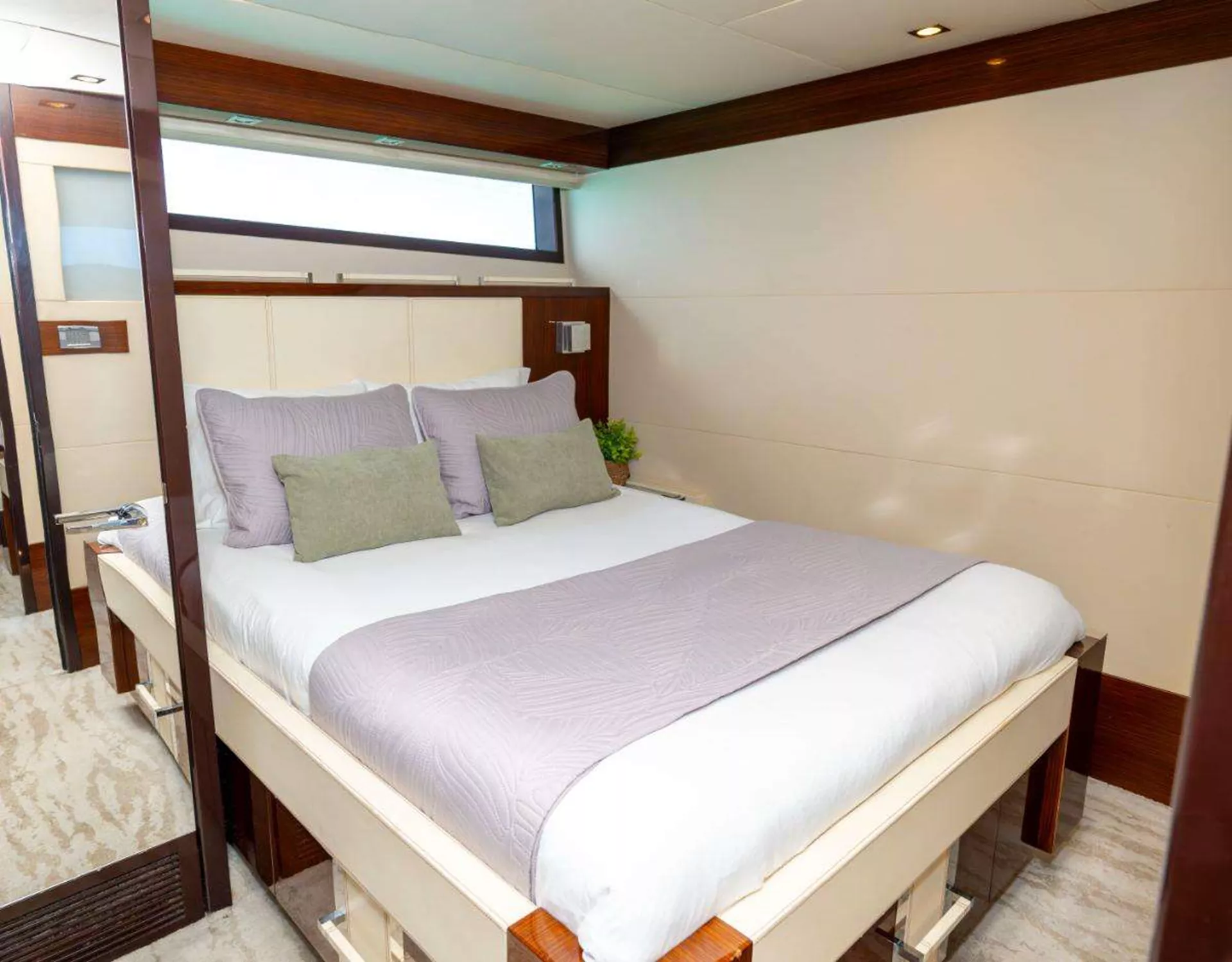 Situated midship, the full-beam master features a king-size bed, abundant storage, and large portlights that flood the cabin with natural light. The en-suite head offers a spacious shower and premium toiletries for a spa-like feel.