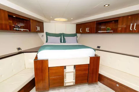 Forward of the galley is the VIP guest stateroom, appointed with a queen-size bed. The en-suite head includes a glass-door shower.