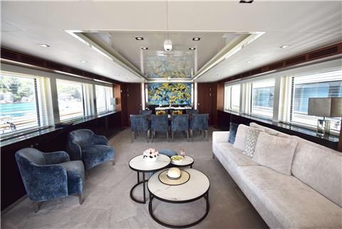 As the sun sets, step inside to discover a world of sophisticated elegance. The interior seamlessly combines varied textiles, rich dark woods, and a light-hued ceiling, creating an inviting and exclusive atmosphere. The lounge, with the spacious dining setup and cozy sofa cluster facing a TV, is the perfect retreat for unwinding. Each cabin, accommodating 8 guests across 1 master, 2 VIPs, and 1 double cabin, exudes warmth, luxury, and ample space. The bathrooms, adorned with stone tiles, glass shower doors, and subtle silver details, breathe timeless sophistication.
