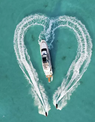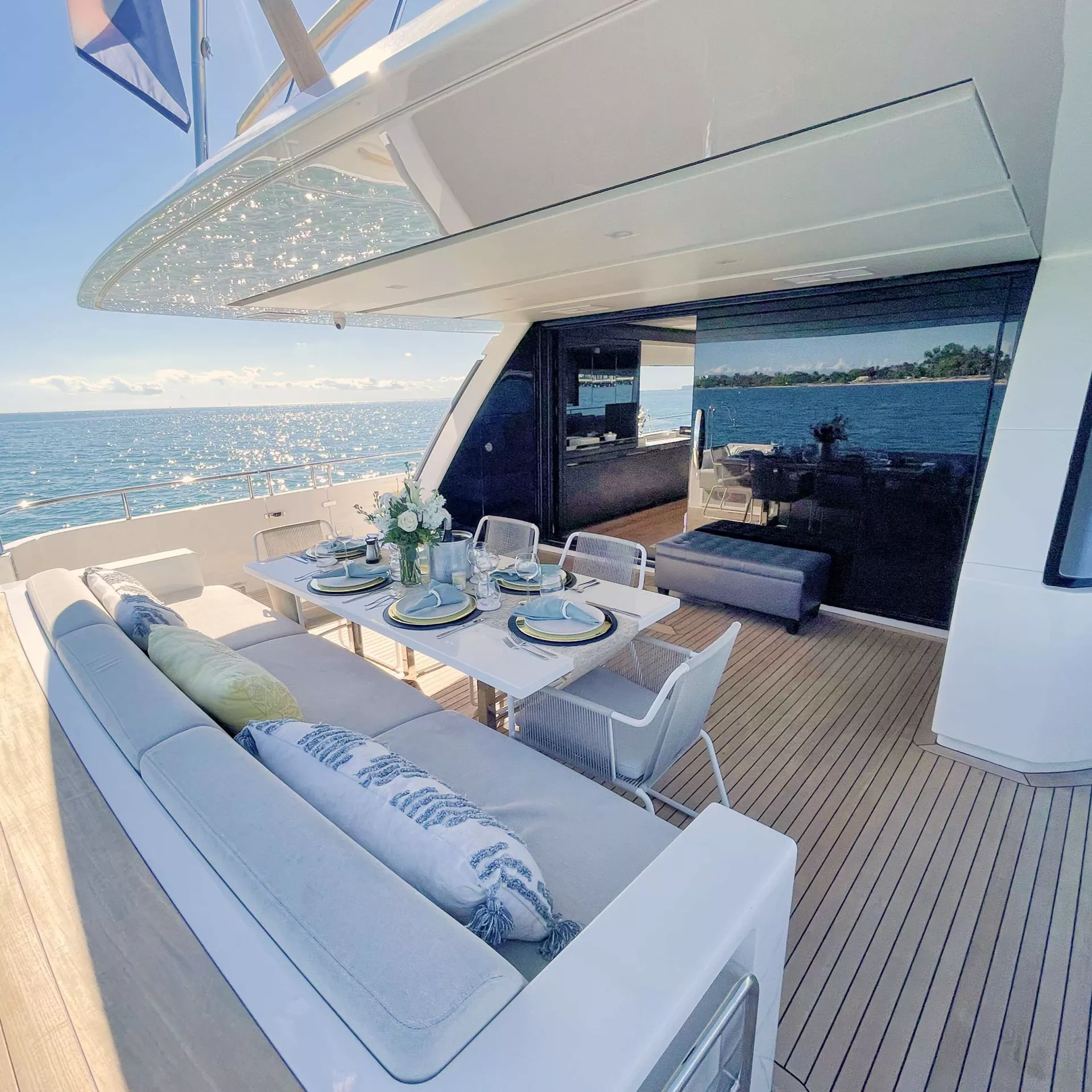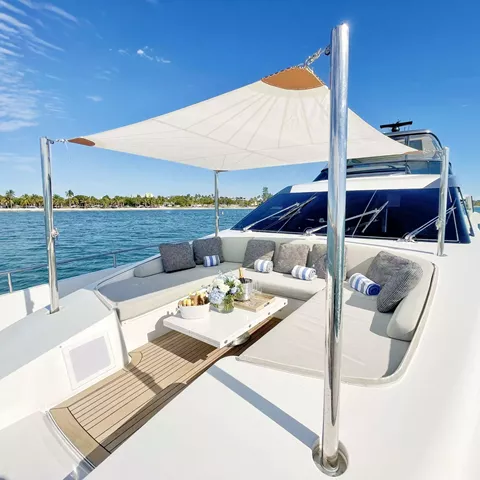 The flybridge is guest ready at all times and transforms to set the mood. Fitness enthusiasts can set up the weight bench, yoga mats or make use of the aft area for their own work-out program with or without one of the crew joining in for motivation. For those looking to celebrate an evening in style, this deck also transitions to an excellent party place/ dance floor with their $100k sound system, special lighting and more surprises. All of this, aside from the best place to relax in the sun or dine al fresco under the retractable rooftop after having cocktails at the bar. Optional shade provided both on the flybridge aft and the forward seating/ sunning area which is one of the best seats in the house for panoramic views.