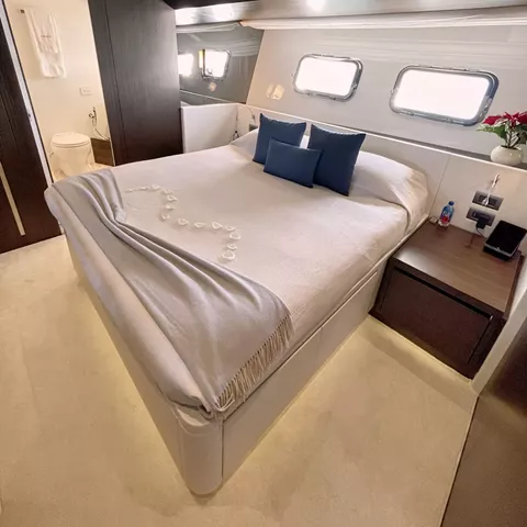 All cabins located on lower deck. Master cabin features a King bed, walk-in closet and rainfall shower. VIP cabin includes a Queen bed and large en suite with shower. The remaining two cabins are both twins, one which includes a pullman for a small child, each en suite.