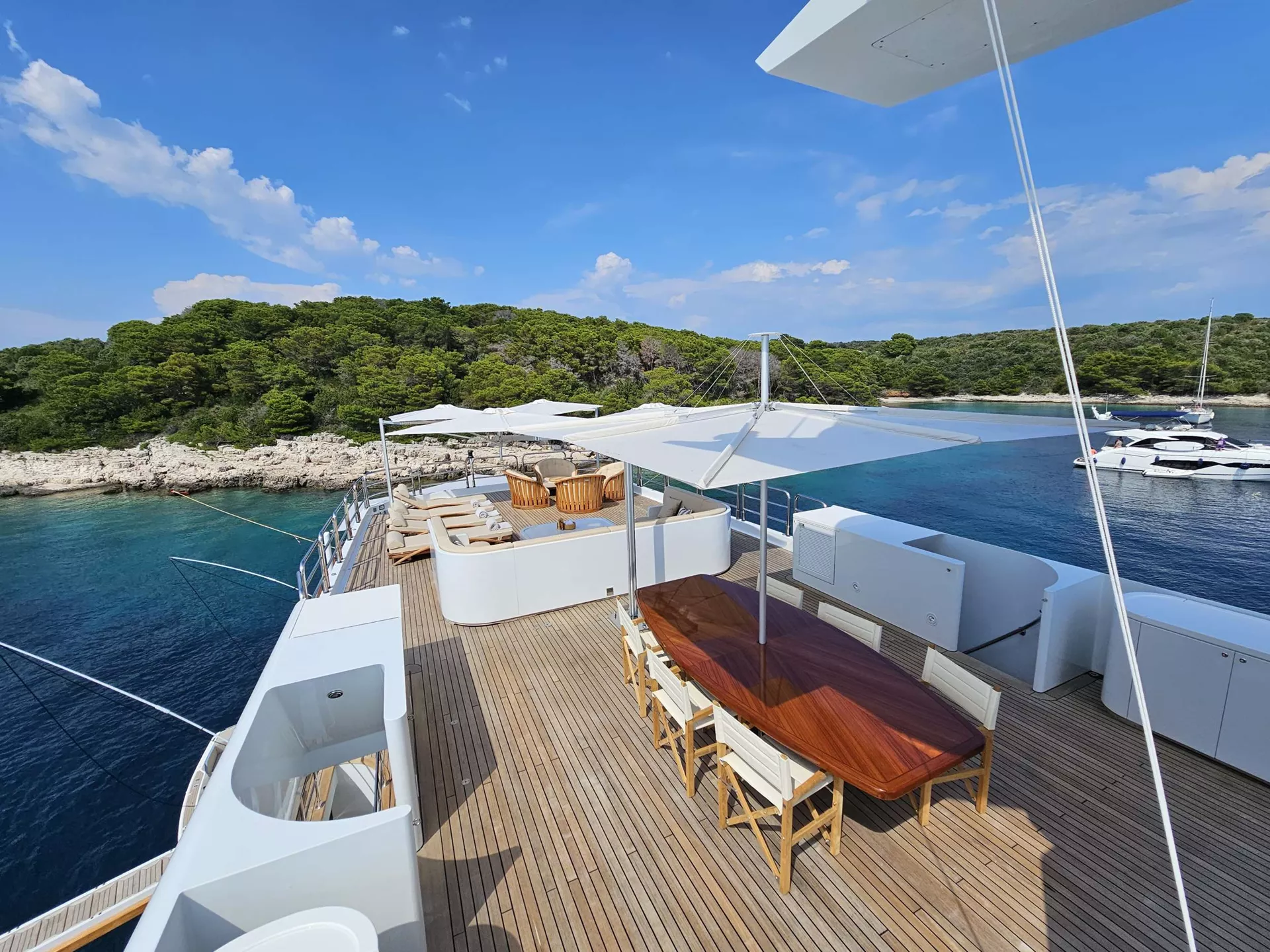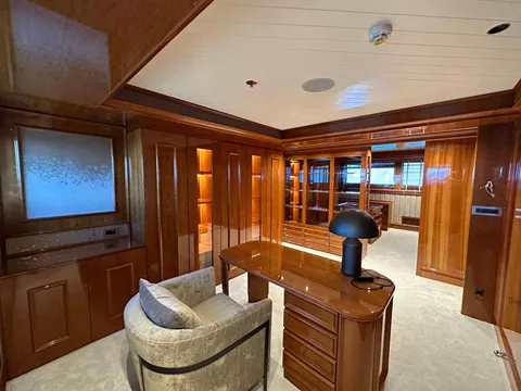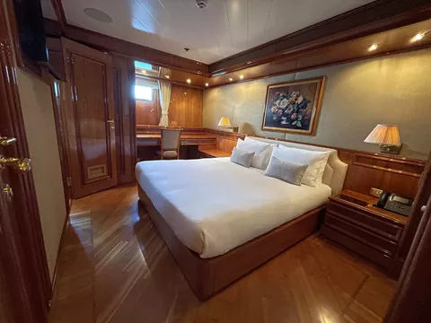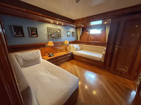 Isabell Princess of the Sea has all the elegance and finesse of a Classic yacht, combined with benefitting from a €10m refit which was completed in 2023, bringing her interior up to modern day standards and prerequisites. The Master suite comprises of a Main Bedroom with lounging and make up areas, a walk in wardrobe room with clothes and shoe storage, an office, and his & hers bathrooms. There is a compact VIP Cabin on the Bridge Deck, with four spacious cabins on the lower deck, 2 doubles and 2 twin, with each of the latter having a pullman bunk.