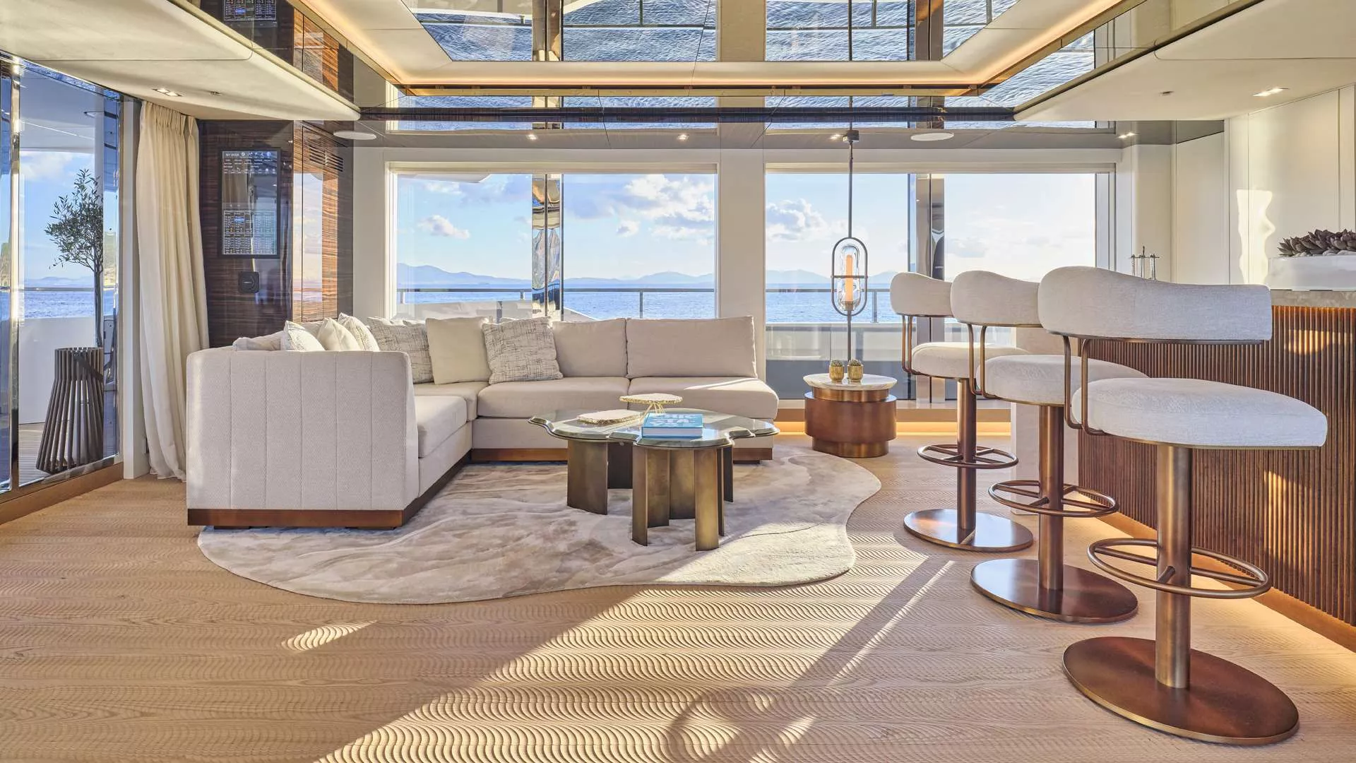 Integrated A/V system allowing control of: AppleTV / Airplay, Seatel Satellite TV, Kaleidascape media storage/player, Entertainment (CCTV, Air con, lights, blinds/curtains control), for use in every guest cabin, sky lounge, sun deck, main salon, crew mess and captain's cabin