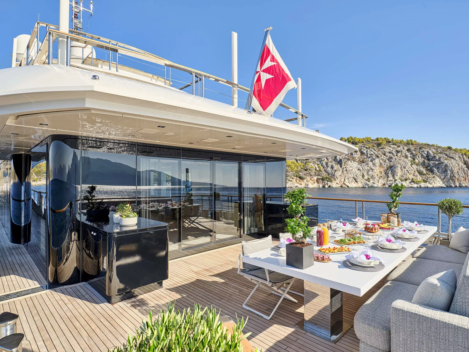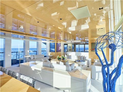 SALOON AND DINING AREA The very large main deck salon and dining area are encased by floor to ceiling windows, giving a tremendous amount of light and incredible views of the sea. There is ample seating in the salon area and the large dining table seats up to 12 comfortably.