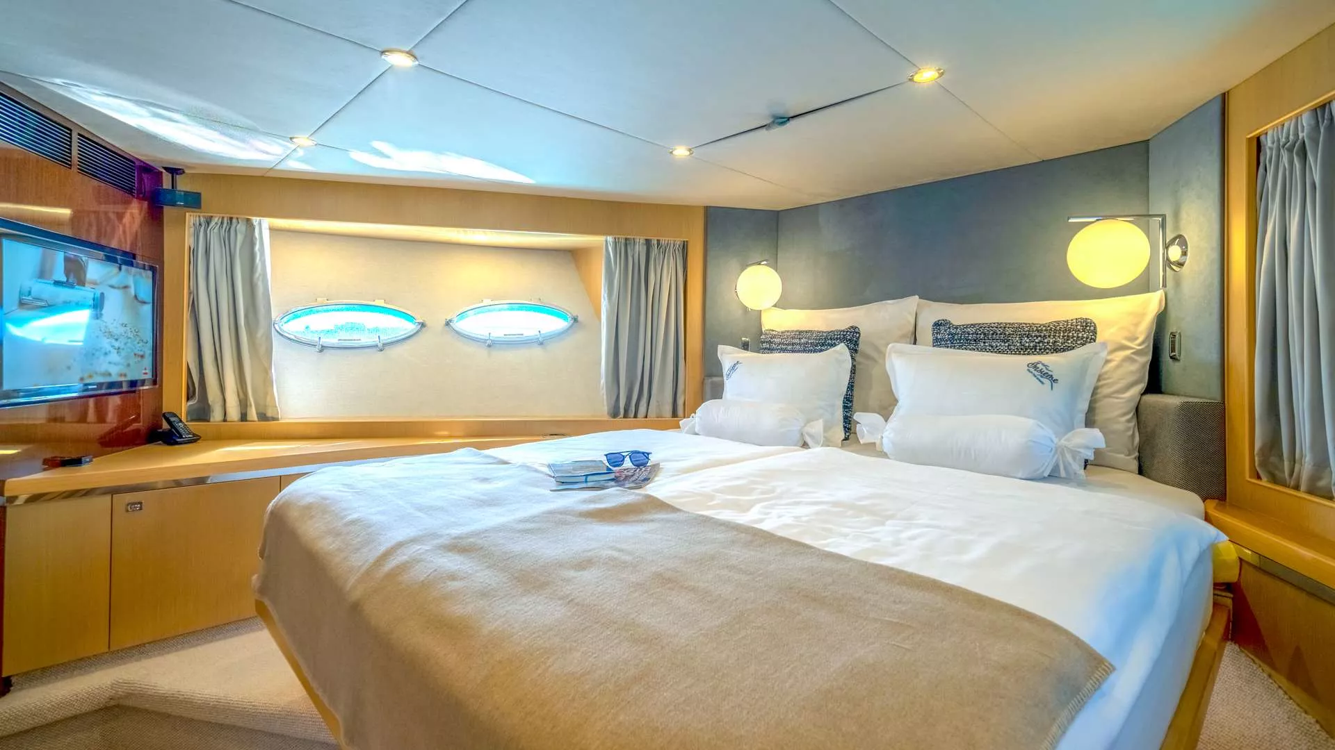 1 x Master cabin with Kingsize bed, ensuite bathroom with double sink, walk-in closet, desk with safe and day bed (bed dimensions: 185x 195 cm)