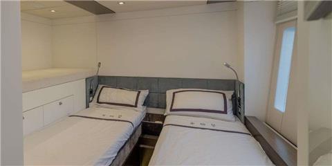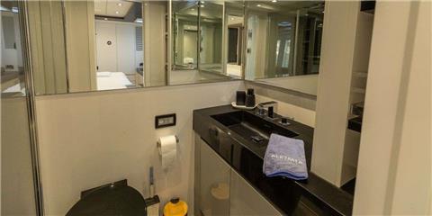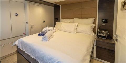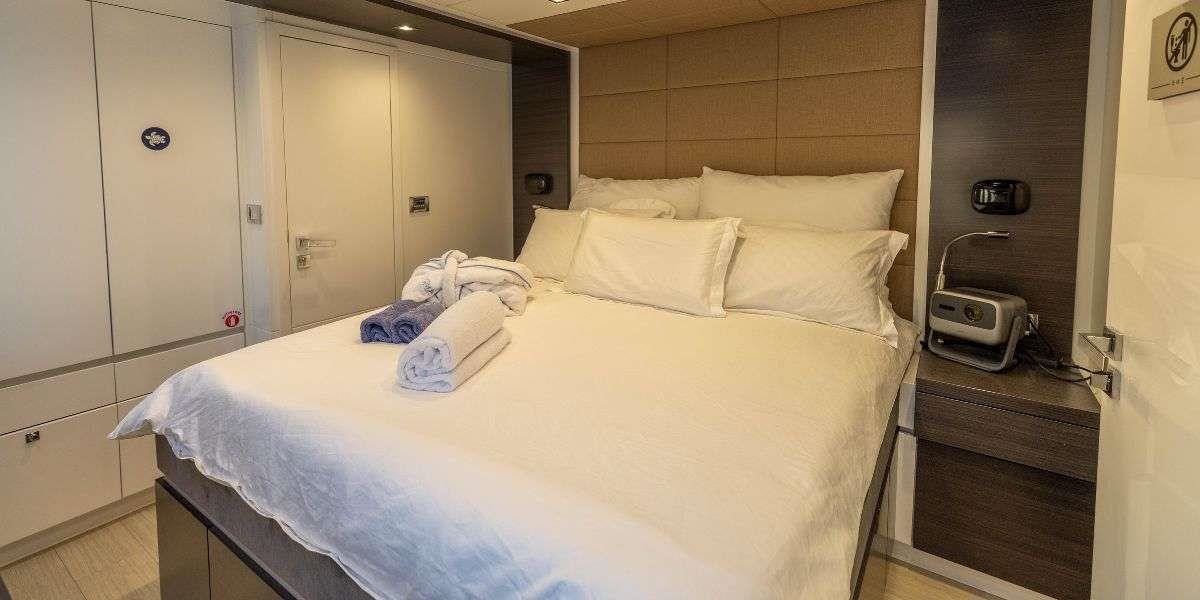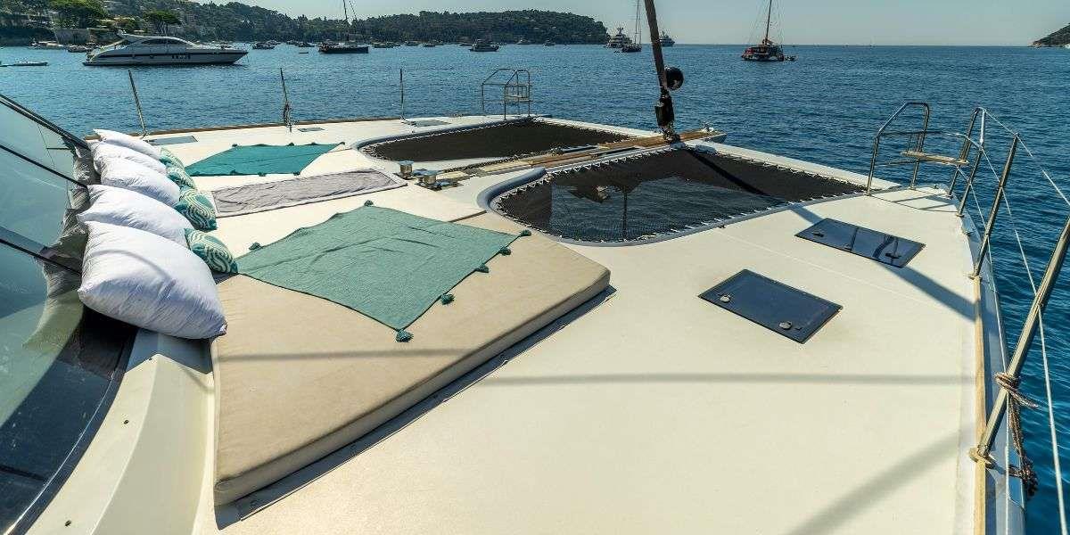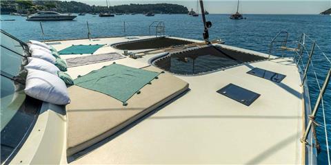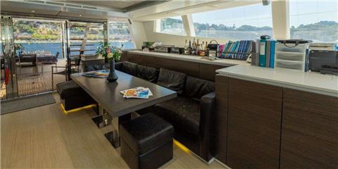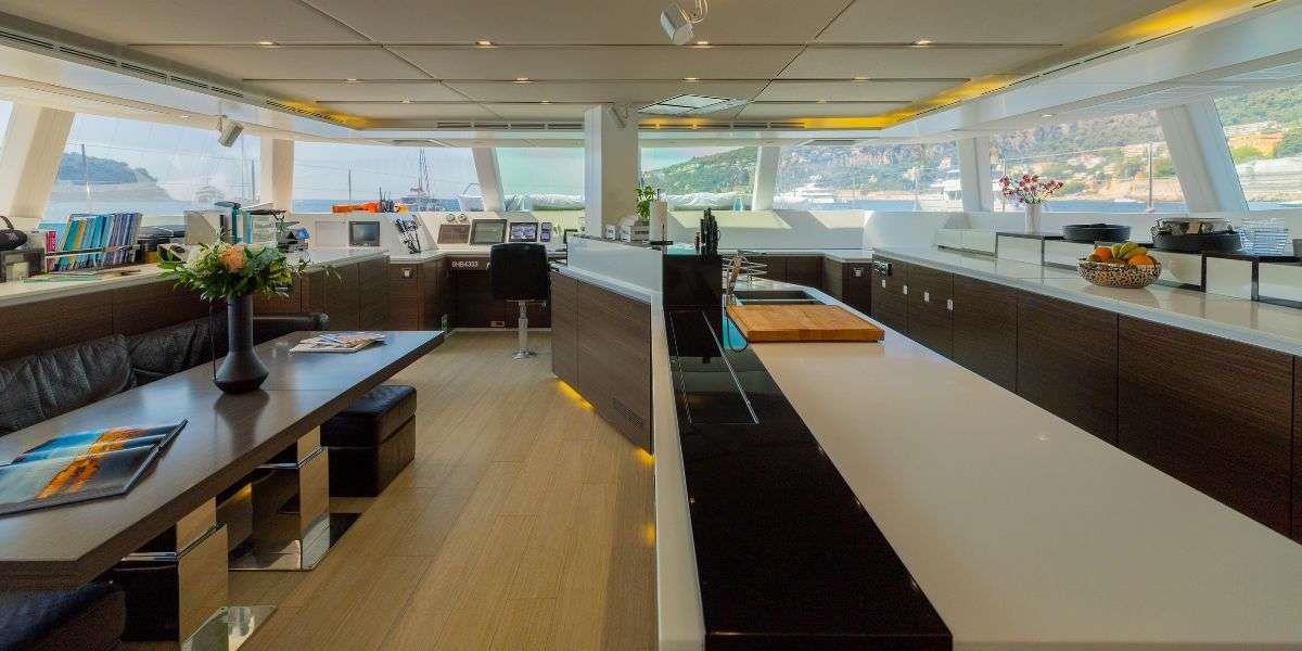 Her 45 sqm cockpit connects seamlessly to a bright, open-plan saloon, creating an easy indoor-outdoor flow that works perfectly for both relaxing and socialising. The space is filled with natural light thanks to large panoramic windows, while comfortable seating and a pop-up TV with surround sound make it equally suited for quiet evenings on board.