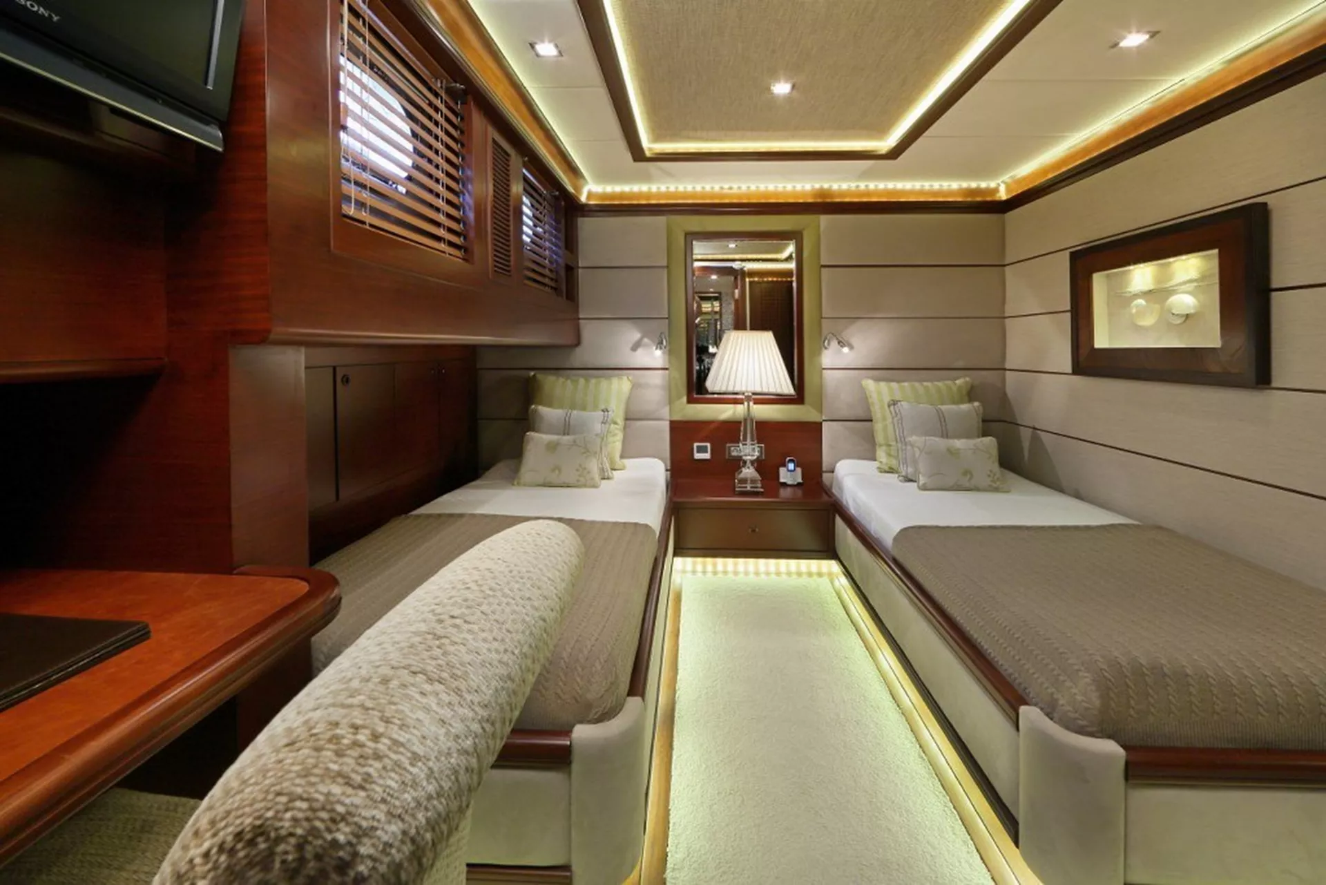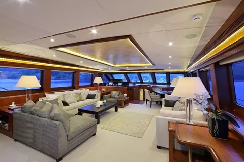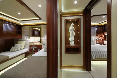 The comfortable accommodation includes a full-beam master suite, a VIP double guest suite, another double guest suite, and two twin guest suites.