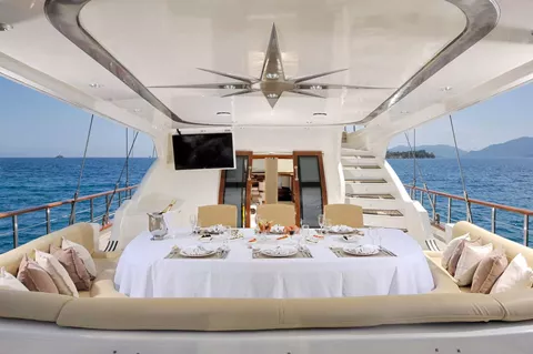 The luxurious saloon’s large panoramic windows invite all the sunlight you could want and ensure you miss none of the passing scenery. The vast deck area provides all the sun, or shade if you prefer, on demand on both fore and aft decks and you may choose to snack or dine on either.