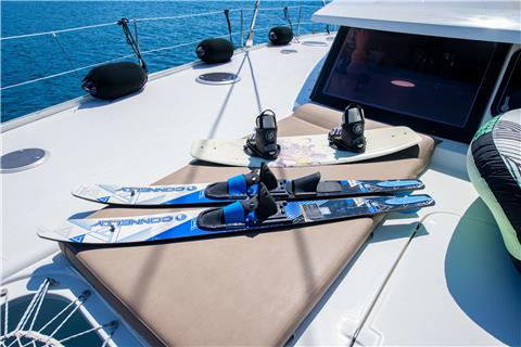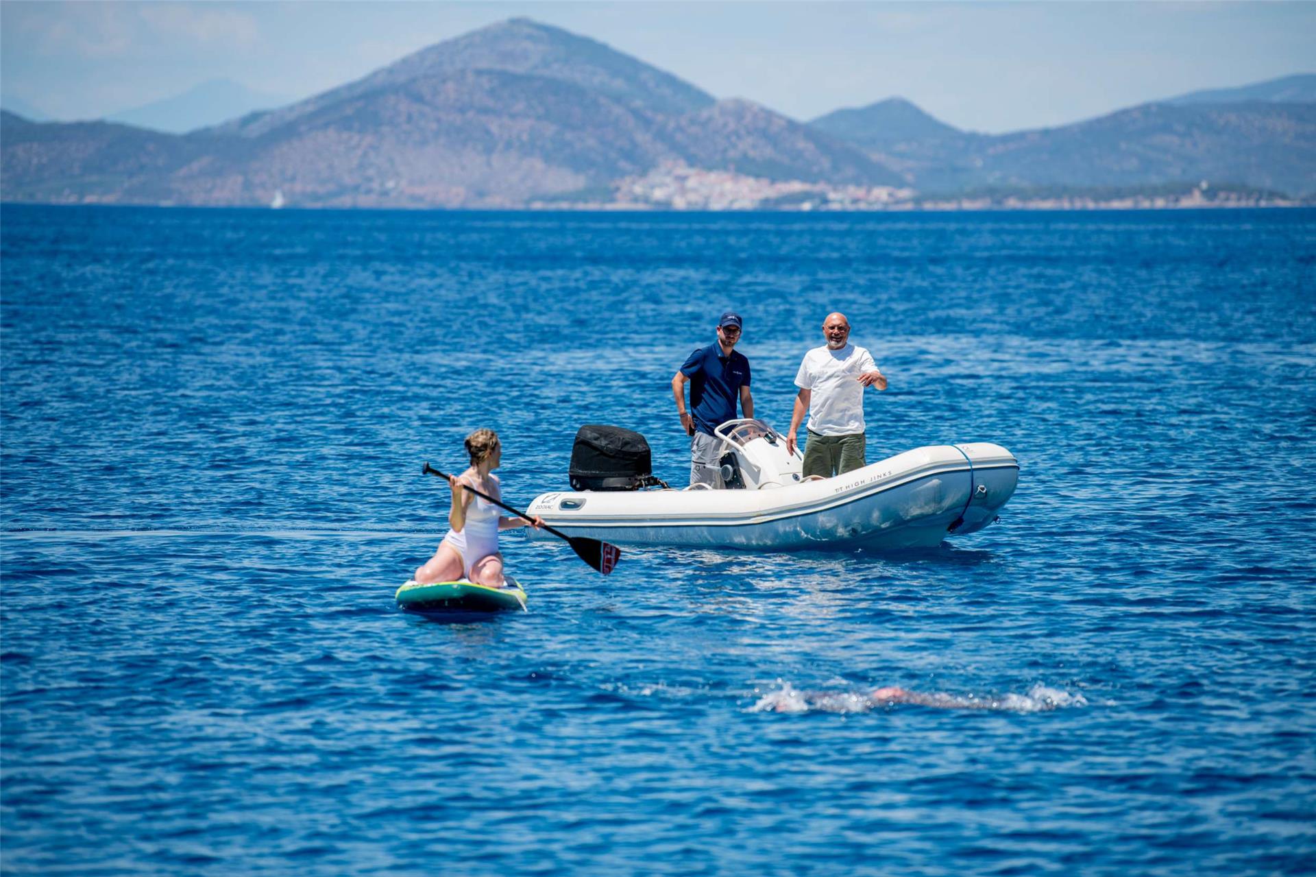 The aft deck, where you probably will spend most of your time at, is stylishly designed for your comfort, either when gathering around the table to enjoy a fabulous meal, filling the air with Mediterranean flavors, or simply relaxing, with an aperitif in your hand, after an exhausting day, playing with the numerous water toys, such as water skis, kayaks, paddle board, wake board, knee board, tubes, snorkeling gear etc., you have on board. Then again if you like fishing and catch something, your Chef can prepare it for you the same day and serve it to you in the most delicious way, you can imagine.
