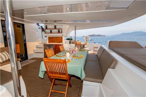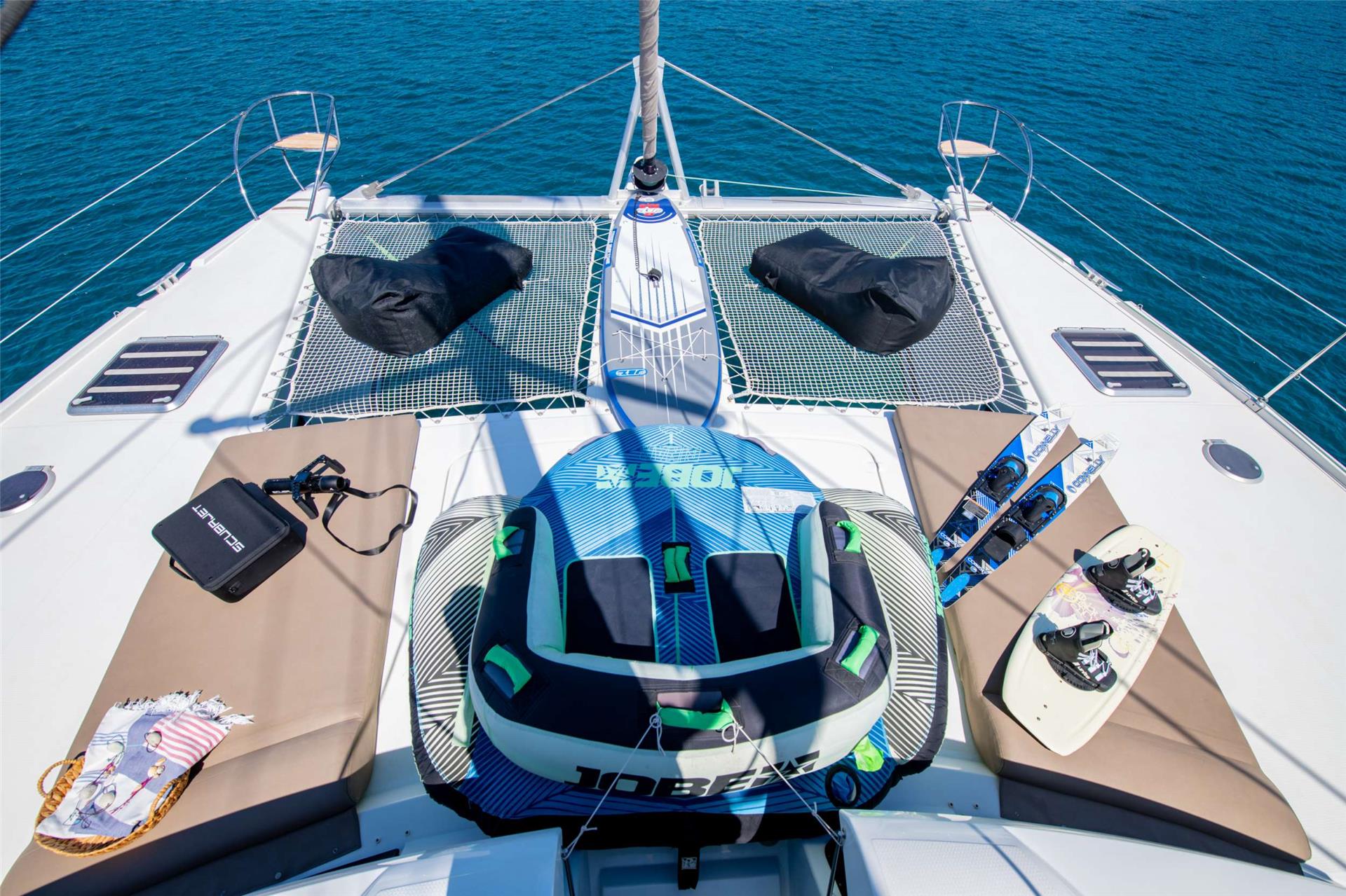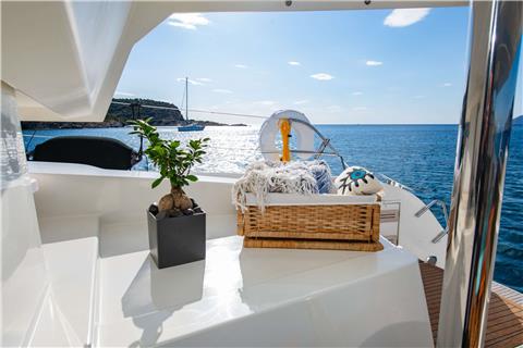 The fore deck is the absolute ideal area for sun-bathing on comfortable sun mattresses, a trampoline, and the best location, if you see any dolphins swimming alongside the boat. The Fly-bridge is the ultimate favorite place for enjoying a glass of champagne accompanied by a finger-licking hors d'oeuvre, while gazing onto the horizon and harmoniously savouring the dreamlike scenery during a sunset.