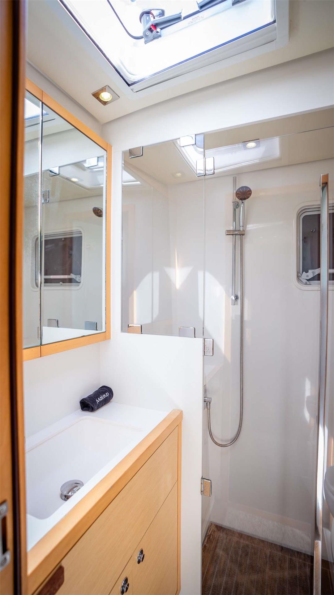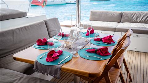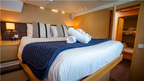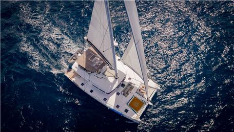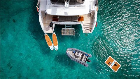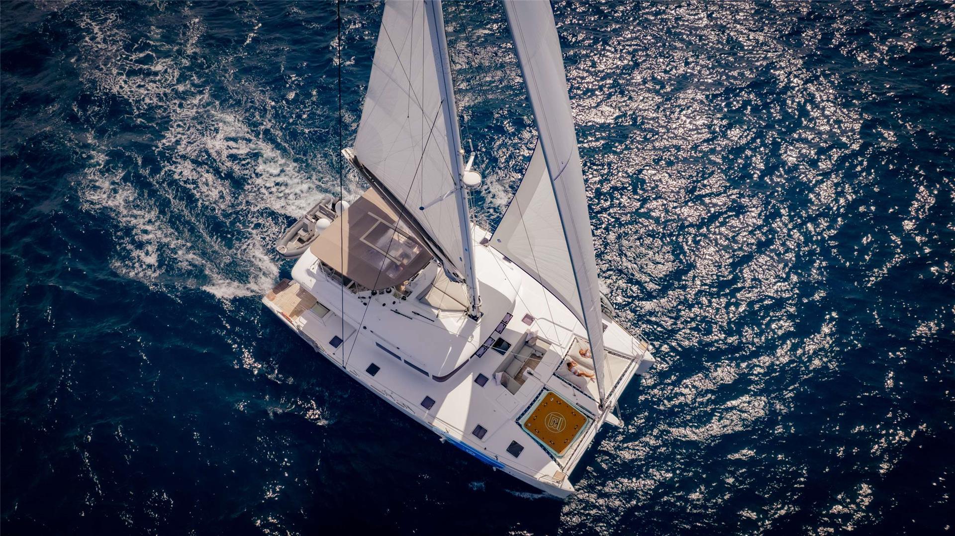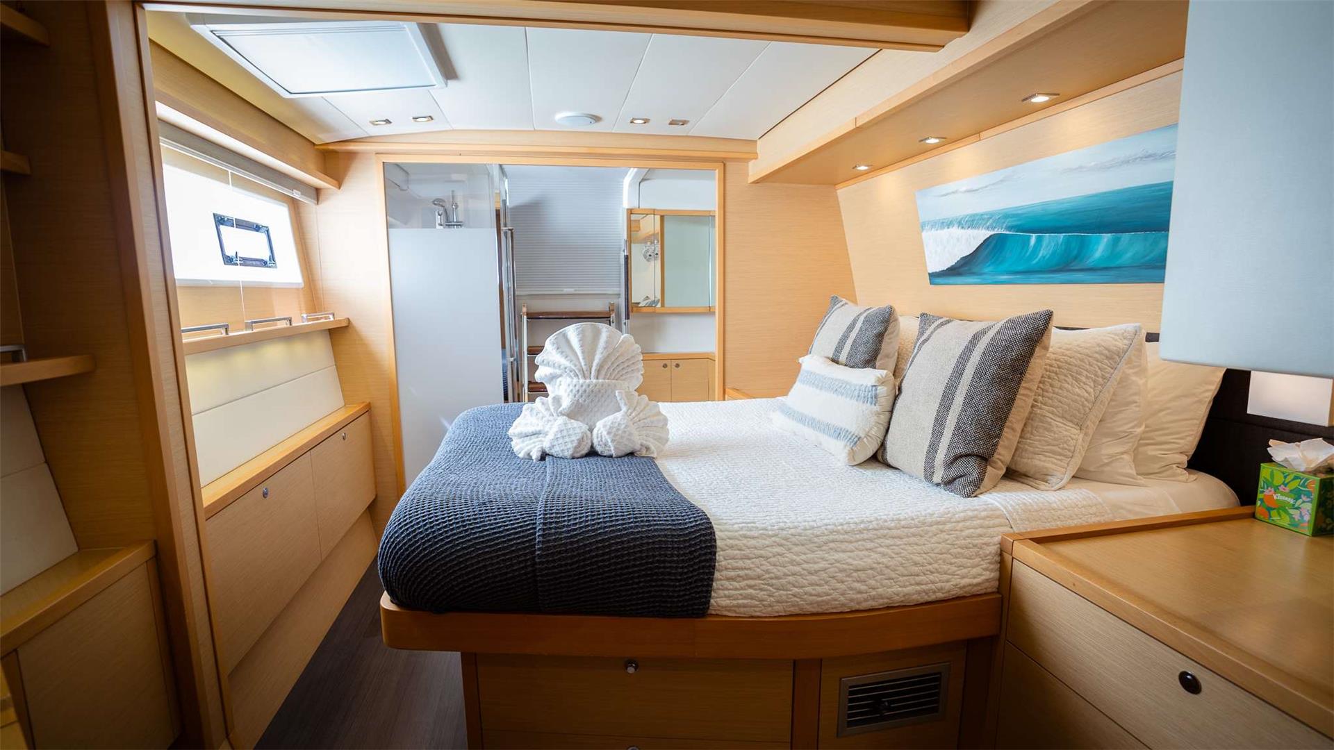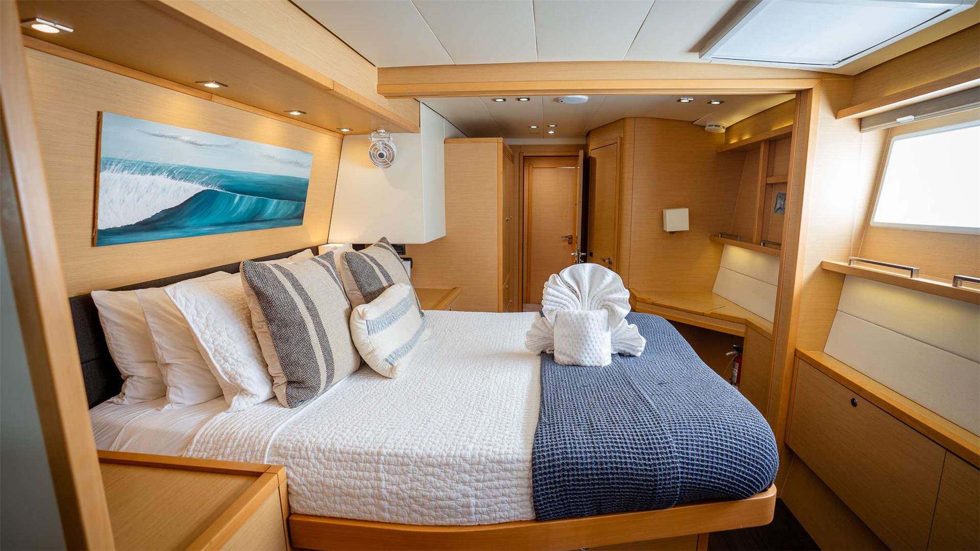 No expense was spared in outfitting this gorgeous luxury sailing yacht which offers four guest cabins (for 8 guests), each with their own private bathroom, a salon with 360 degree windows, 2 dining areas and a foredeck sitting area. Amenities and toys include TVs in each cabin, 2 trampolines, a 15-foot tender for wakeboarding, tubing or zipping to gorgeous beaches, 2 standup paddleboards, a floating dock, a hydraulic swim step for easy water access, and snorkeling and diving gear. Bluewind’s elegant yet minimalist design provides the handling of a performance sailing catamaran while offering the ambience and amenities of a world class resort on the water. Spacious design of the cockpit and flybridge areas offer guests panoramic vistas, al fresco dining and ample space for lounging, whether in sun or shade.