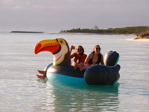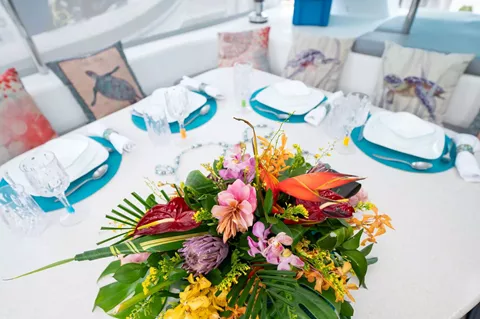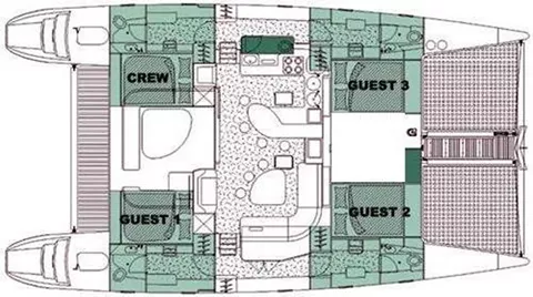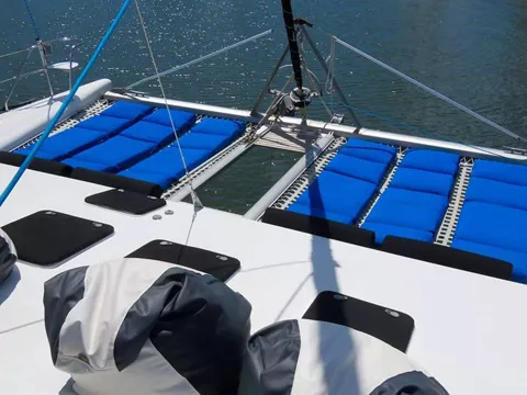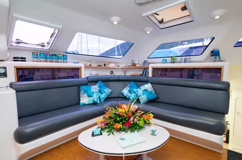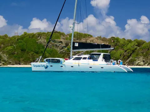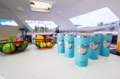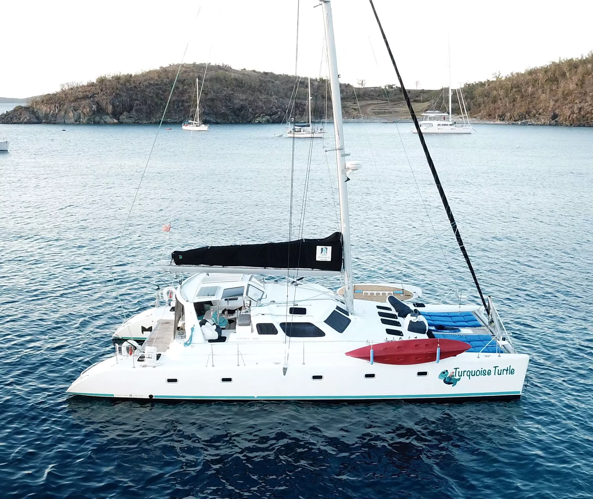 Turquoise Turtle is a Voyage 500 sailing catamaran with 3 ensuite queen cabins. She has a spacious salon and cockpit for dining and entertainment, and two large trampolines forward for lounging in the sun and enjoying the fresh ocean breeze. She offers lot of water toys for young and old at heart. There is also water access from a drop down ladder on the bow.
