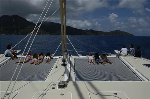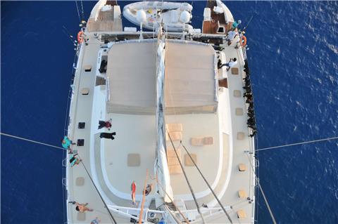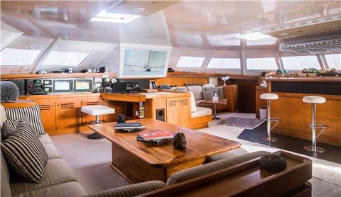A large cockpit offers alfresco dining and seating. Scattered with overstuffed sun cushions, guests can relax on deck under the shade of the bimini, or enjoy the warmth of the tropical sun on the foredeck.