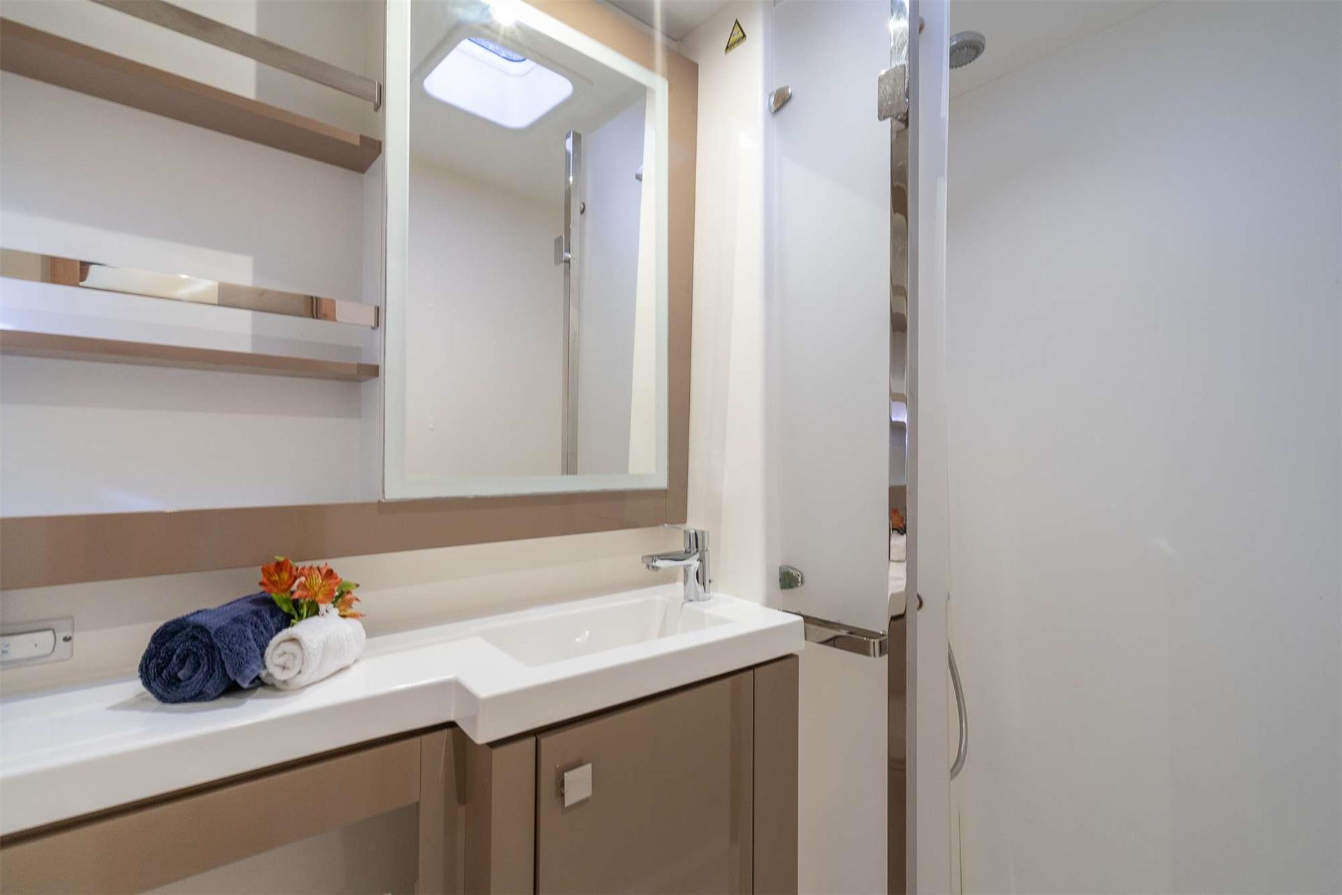 The salon feels immense, modern and bright, with large windows that provide good visibility. There are both indoor and outdoor dining options, as well as space at the helm to enjoy the view while underway. The cabins offer ample space for both sleep and storage. The design speaks comfort, both inside and out.