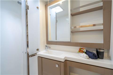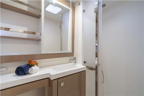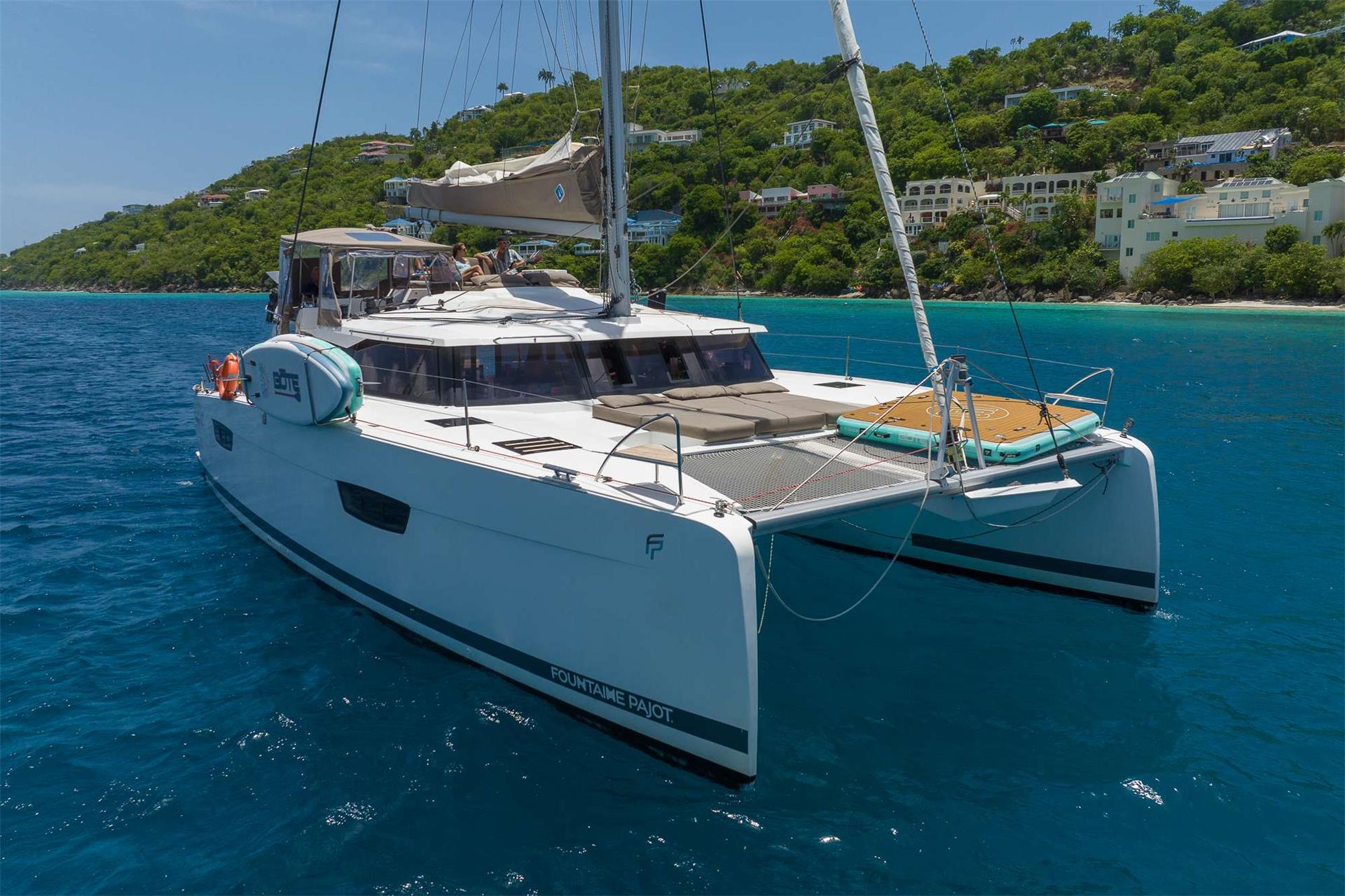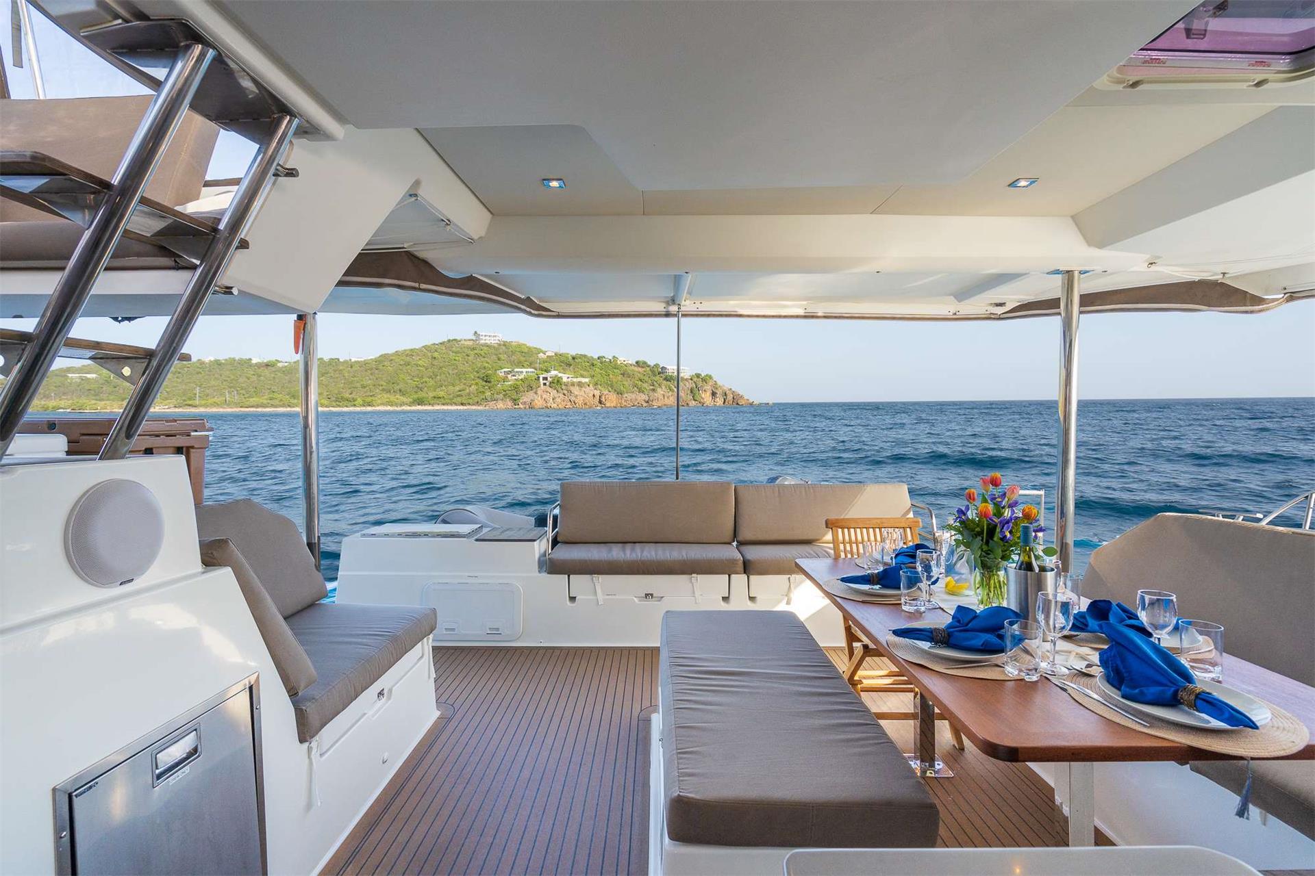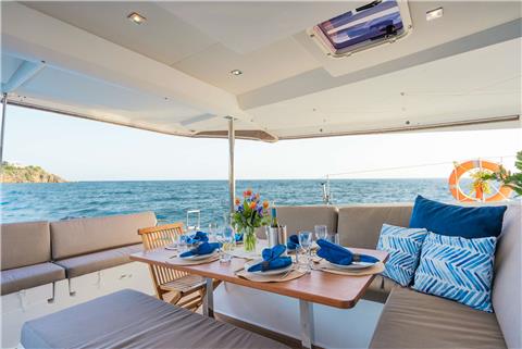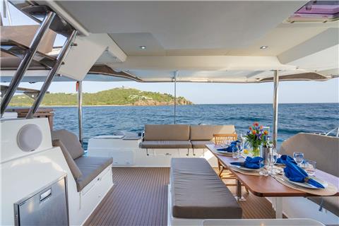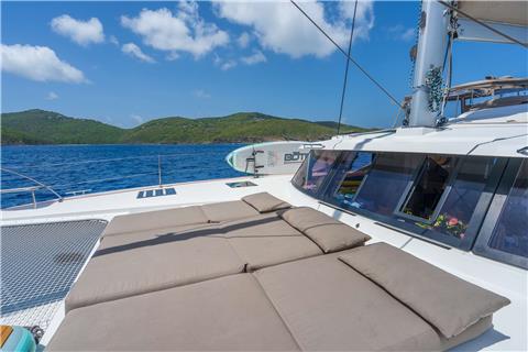 The Fountaine Pajot Saona 47 maximizes living and entertaining space. The aft lounge area is expansive, making it the social center of the boat; providing seating, standing and reclining space for a multitude of guests. For those that seek the sun, the lounging area at the front of the yacht provides a cushioned space for sunbathing where the view is unobstructed.