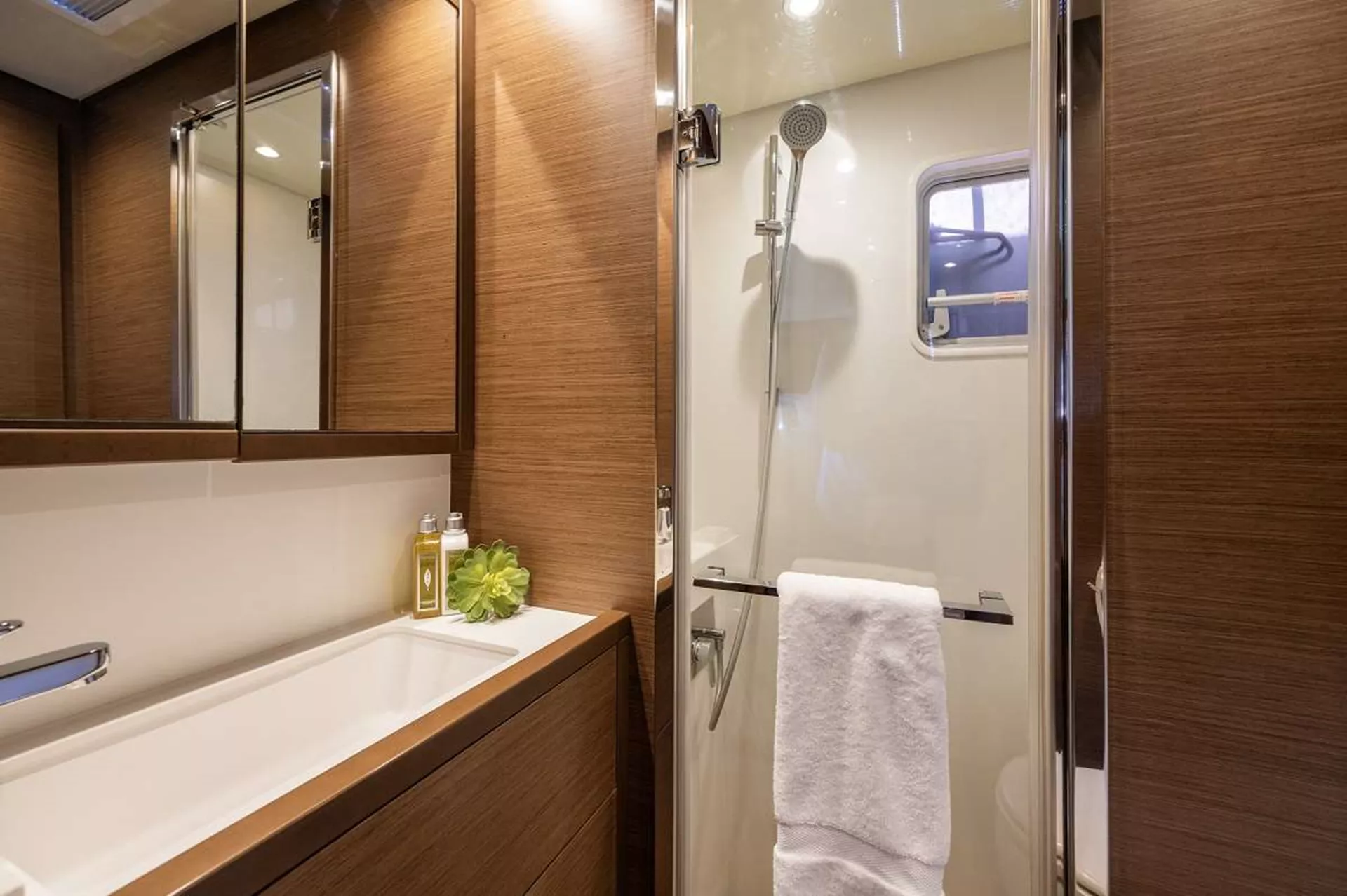 Dragonfly is a luxury yacht that accommodates up to 8 guests in 3 queen cabins and one bunk cabin, each with its own en-suite head with a dry shower. The master cabin suite aboard DRAGONFLY includes a seating/lounge area and desk, queen-size berth large glass shower stall and separate vanity area and offers direct access to the aft deck for slipping out to gaze at the stars and take a midnight dip off the stern. The master suite also has direct private access to the main salon.