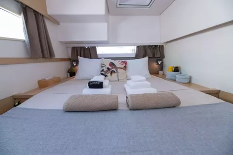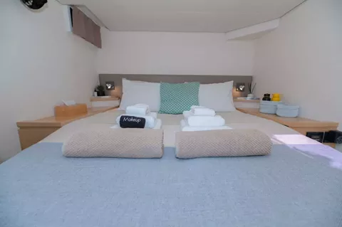 Purpose is the Quintet version of the Saba 50, offering five guest cabins in total: three located in the port hull and two in the starboard hull. A sixth cabin, situated mid-starboard, is reserved for the crew. All guest cabins feature private en-suite bathrooms, ensuring comfort and privacy for every guest.