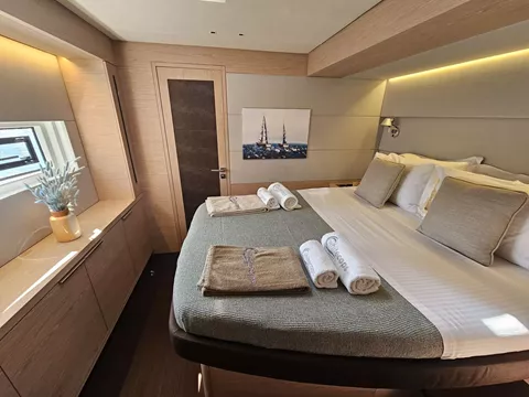 WHITECAPS is a remarkable Lagoon 65 catamaran, custom-designed to deliver unparalleled comfort, safety, and modern convenience. The vessel accommodates guests in five signature cabins, each uniquely decorated and color-coordinated—Orange, Blue, Black, Brown, and Green—with matching beach towels for a thoughtful, personalized touch. Captain Christos, having been onboard from day one, and his crew of three, including a Chef, ensure seamless service and an exceptional onboard experience. Innovative features include a wide, accessible passarella suitable for all guests, even those with baby carts, and a flybridge equipped with an electric roof that opens to reveal a 130-inch cinema screen with surround sound, streaming services, and HDMI connectivity for laptops. Every cabin is fitted with a backlit make-up mirror, combining practicality with elegance, while a 5G Wi-Fi router with telephone functionality ensures seamless connectivity, including emergency international calls. With careful attention to detail and a commitment to enhanced comfort and sustainability, WHITECAPS offers an extraordinary experience for those seeking both luxury and thoughtful design at sea.