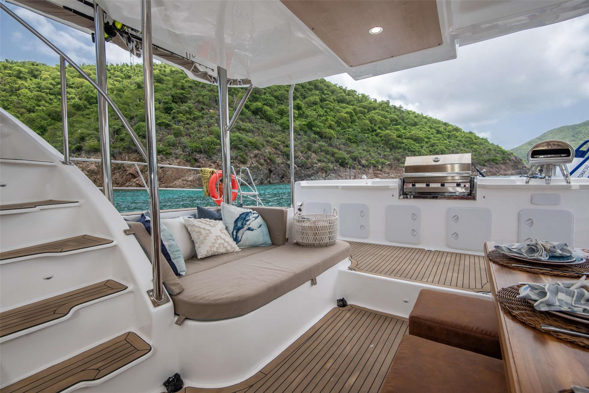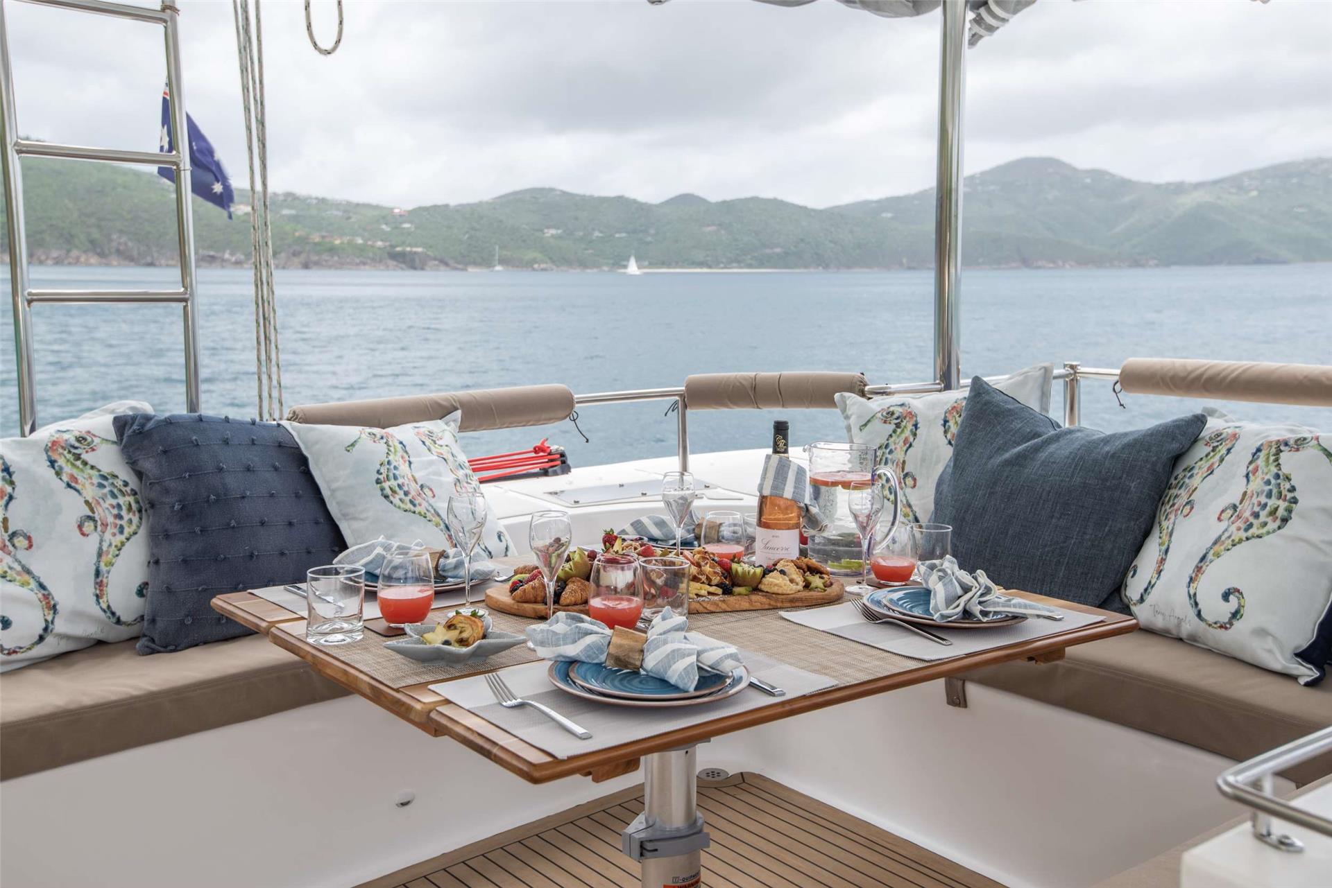 Tapas will accommodate 10 charter guests in 5 spacious queen cabins, each with their own television as well as separate head and shower. She has a 14ft tender with 50 hp outboard engine and Bluetooth sound system, solar panels, air conditioning, water maker, ice maker, wine fridge, pizza oven, a fully customizable menu, Caribbean made ecofriendly and reef safe toiletries, a bar stocked to guest preference, coffee/espresso machine, rendezvous scuba diving, snorkeling gear, underwater scooters, wakeboard, stand up paddle board, ski tube, 10 ft. floating dock, pool noodles, fishing gear, board and card games, television in the salon, sound system and