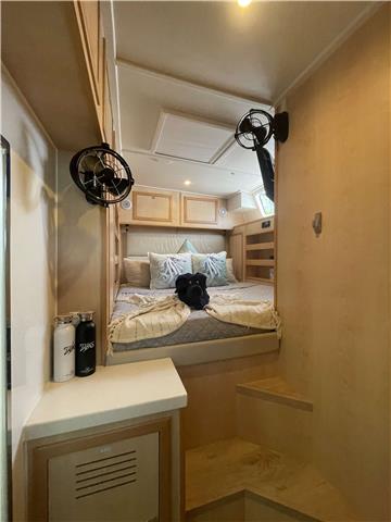 The interior space is unparalleled. A spacious galley with wrap around counter space opens to an interior dining space, which brings the total dining space options to three. On either side of galley are the hallways leading to the cabins. The hallways feature a pantry as well as an immense capacity for storage and lead to each cabin, which are set apart and separate, making each one feel like a private oasis.
