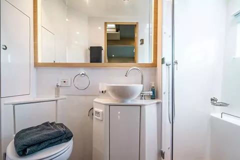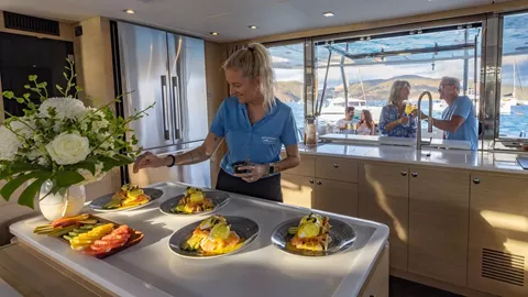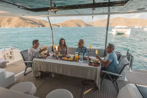 When the sun has set and you are ready to rest, you will feel at home in our spacious and comfortable cabins. Each cabin is equipped with storage space for your belongings and a queen bed. (King in master) The galley and salon have a contemporary configuration and an open-concept space perfect for enjoying time with friends and family. A flat screen TV is placed on the back wall for viewing pleasure in and out of the saloon at the barstool seating. Wi-Fi and StarLink are also included should you choose to stay connected on your dream vacation.