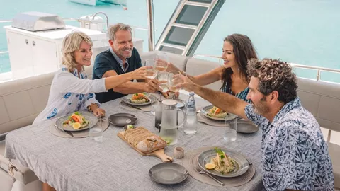 Includes: Private 54' power catamaran. One Master Cabin with King Bed, Three Double occupancy staterooms with private bathroom and shower. All meals and snacks. All beverages, beer and wine. Fuel, A/C, TV and stereo. Snorkeling gear, stand up paddle board, dinghy. Mooring ball fees, cruising taxes and yacht insurance.