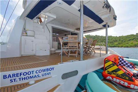 Venture up to the enormous fly bridge and captain from the helm station with a 360-degree vantage point. The fly bridge includes stylish lounge seating with an electric grill, wet bar and refrigerator. This is the place to gather and enjoy cocktails with friends. The fly bridge is also wired for sound. Feel free to dance! The best place for al fresco dinning is on our aft deck. Barefoot Cowboy has a beautiful teak table for 10 and a view of the islands you will never forget. She is the perfect escape for large groups up to 10 guests.