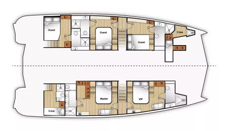 The sailing version of the MOON 6ty features an innovative sail management system. All lines required for sail handling are led to a single location at the helm station, ensuring ease of use and convenience. This allows the entire crew to enjoy a comfortable sailing experience without worrying about complex maneuvers while maintaining a sense of space and tranquility on board. The MOON 6ty is a catamaran that seamlessly blends advanced technology with timeless luxury, designed to meet the needs of the modern sailor.