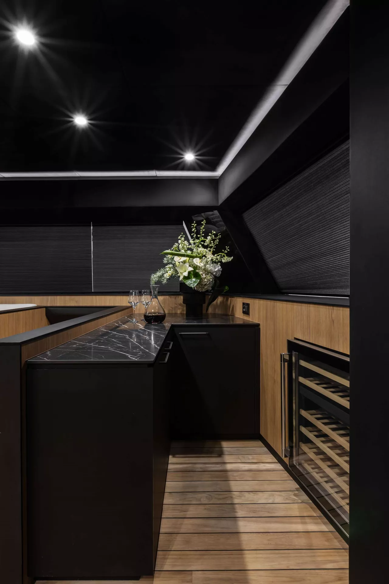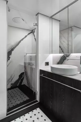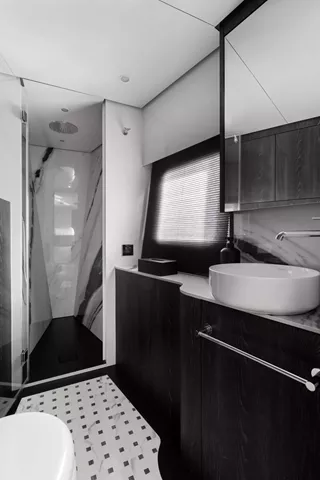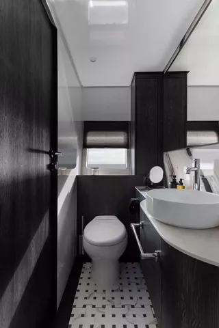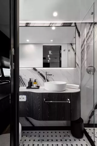The interior of the MOON 6ty is a true feast for the senses—spacious, modern, and fully tailored to the owner's individual preferences. The selection of materials, including natural stone, sintered surfaces, and elegant upholstery, ensures that every part of the yacht forms a cohesive, luxurious whole. Thoughtful spatial arrangement, with attention to every detail, makes the MOON 6ty the perfect space for top-tier relaxation, where each element is unique and designed with passion.