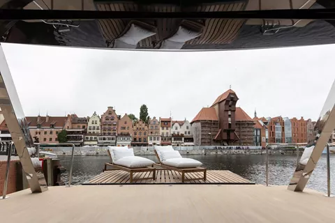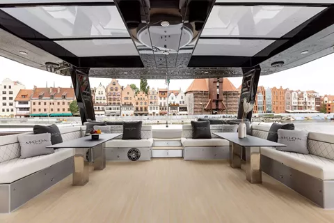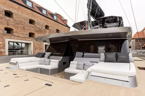 The exterior deck of the MOON 6ty is a space designed to satisfy every luxury lifestyle enthusiast. In the main aft cockpit, perfectly sheltered from the wind, you can unwind in the "al fresco" lounge area or relax on the comfortable sofa. This space seamlessly blends elegance with functionality—from the hydraulically extendable gangway to the wide swim platforms that create a true beach club on the water, perfect for enjoying water toys or soaking up the sun.