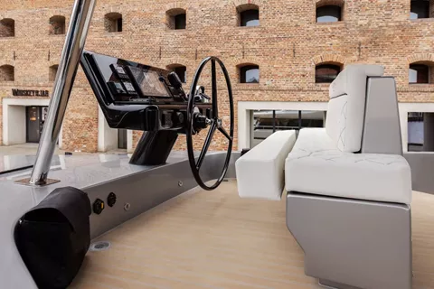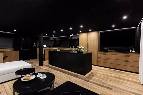 Aft Cockpit: A shaded outdoor lounge ideal for long, leisurely lunches, sunset cocktails, or watching the action in the water.
