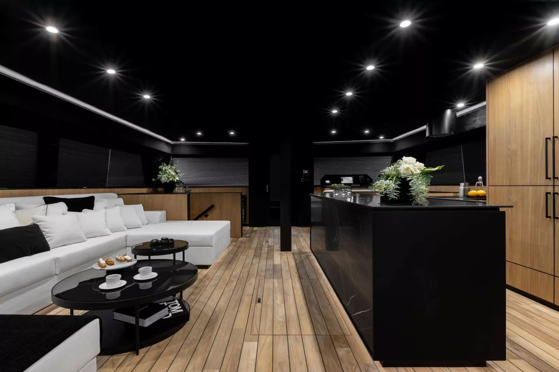 Main Salon: A bright, open-plan interior with panoramic views, sophisticated décor, and plush seating—perfect for relaxing or enjoying a movie.