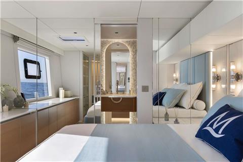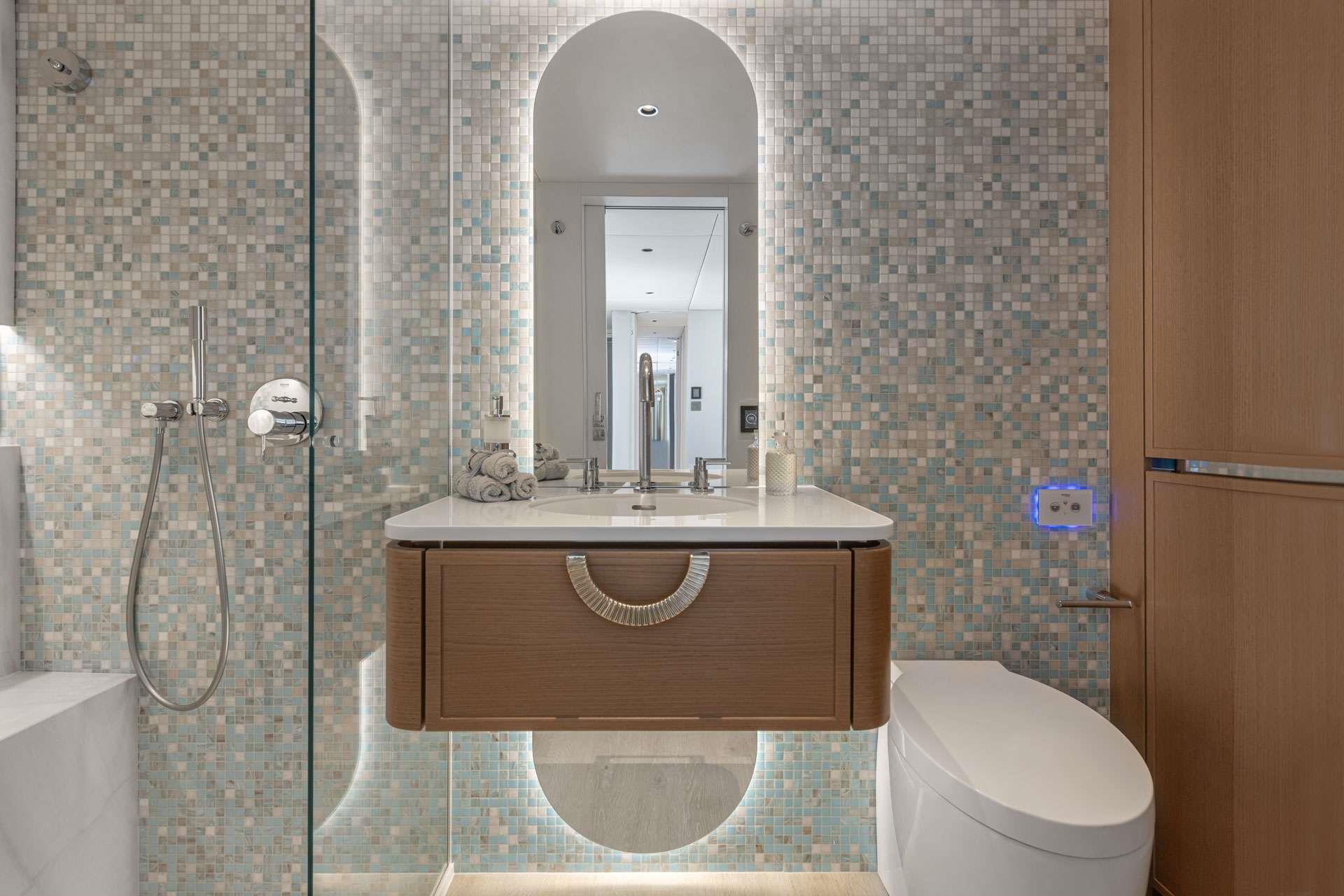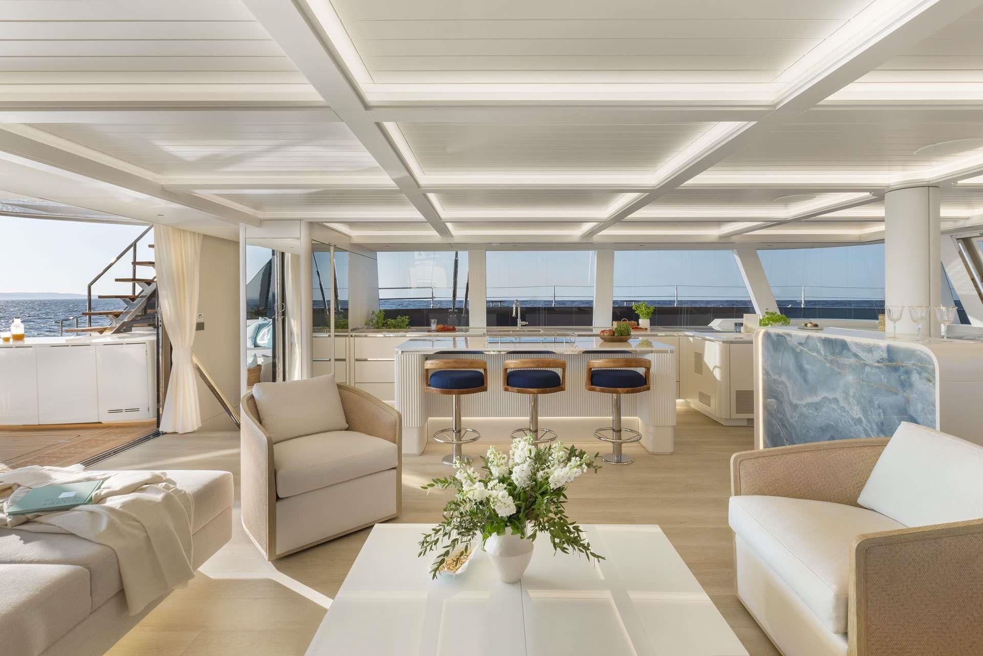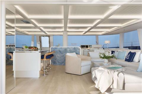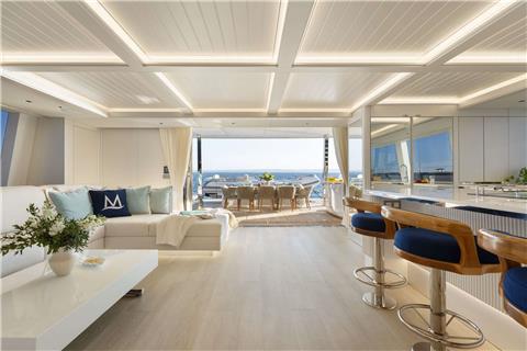 The yacht features expansive deck space ideal for entertaining, including sun loungers on both the fore and aft decks, adjustable circular day beds on the flybridge, and a bespoke beach club seamlessly integrated into the swim platform, providing a shaded oasis from the Caribbean sun. Guests can savor refreshing iced cocktails at their leisure, with three strategically placed ice makers ensuring a constant supply of perfectly chilled drinks throughout the day.