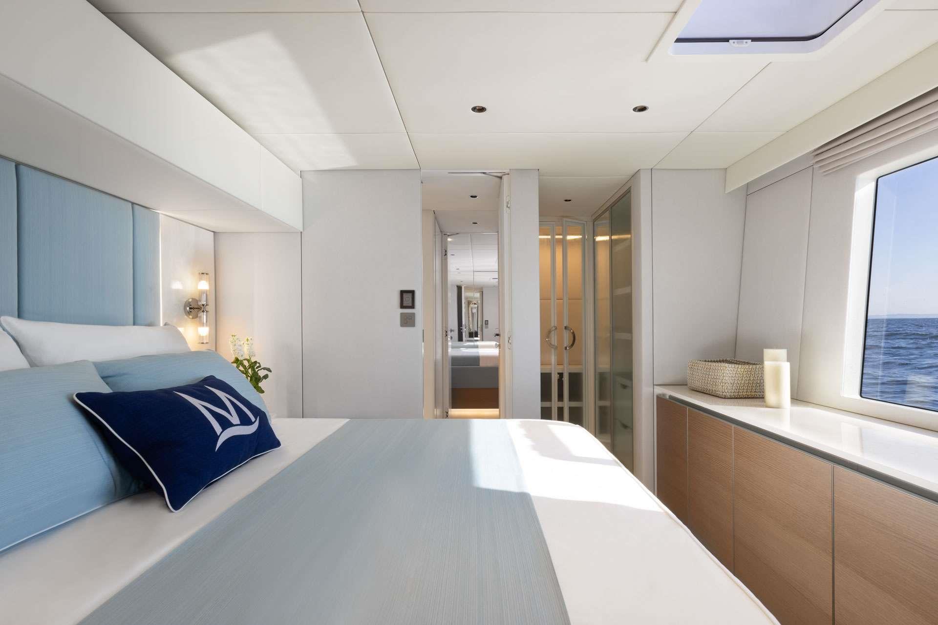The layout consists of 4 double cabins with European king beds (or oversize queen beds) measuring 160x200cm and a 5th cabin starboard aft with a bunk bed consisting of a single and a double bed, along with an additional single bed (see layout).